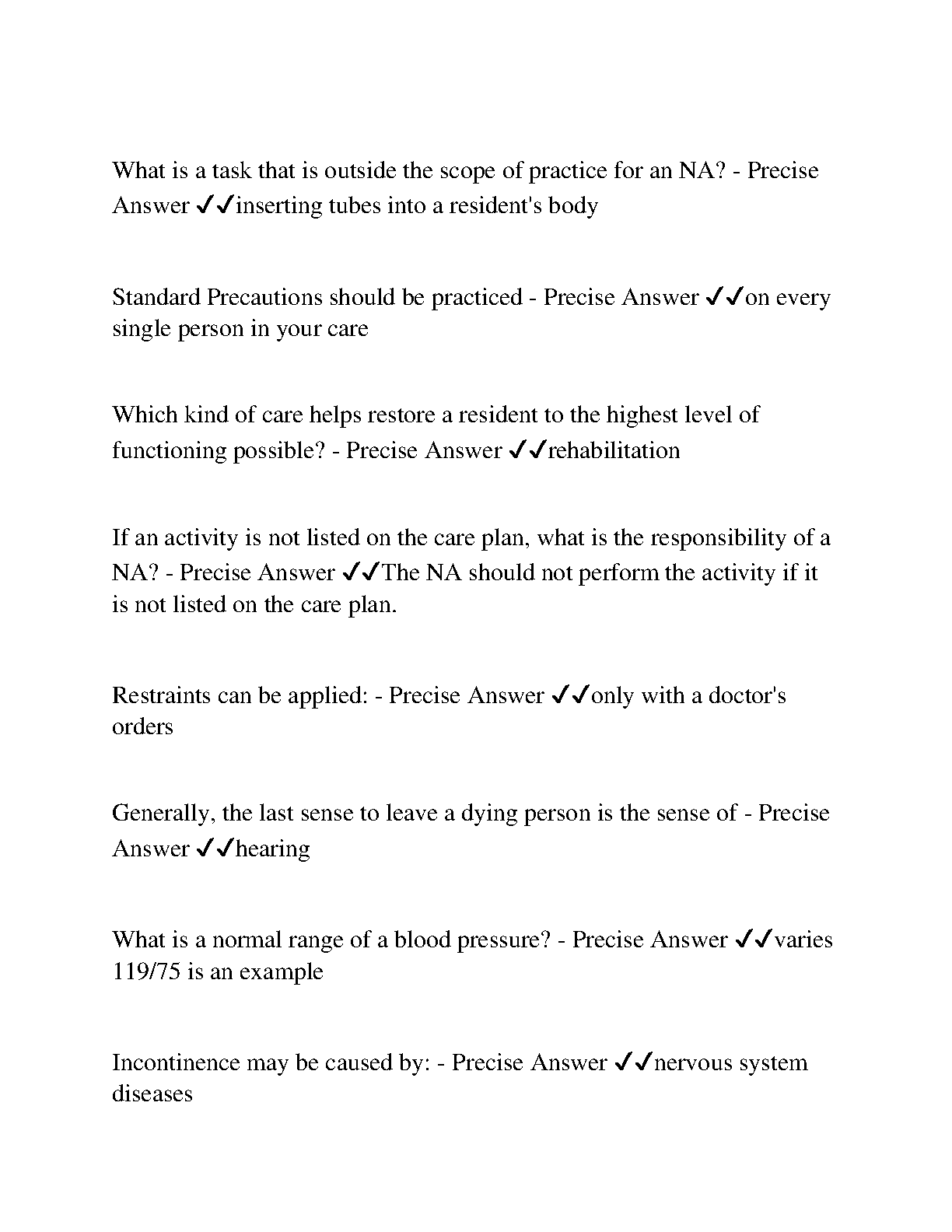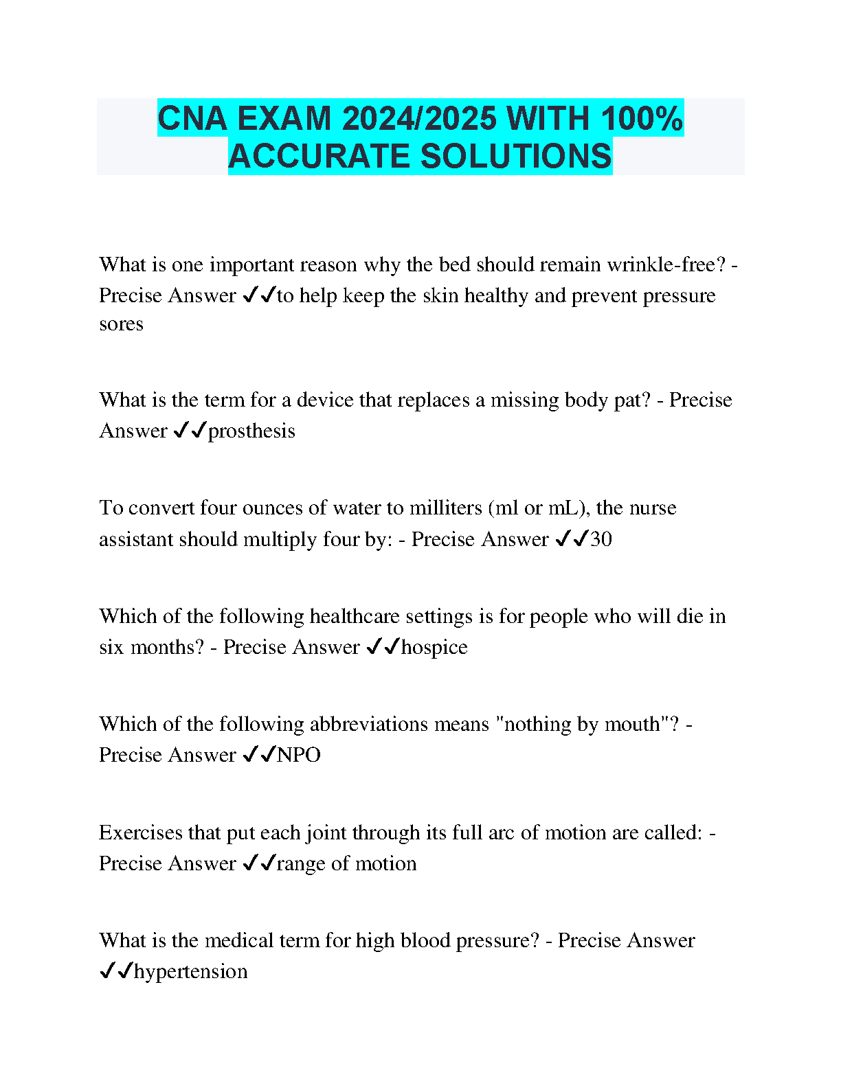 Ace your Certified Nursing Assistant certification with our definitive 2025/2026 CNA Exam Test Bank. This essential study guide features a vast collection of practice questions complete with 100% accurate and verified solutions. It's meticulously designed to cover all key areas of the CNA curriculum, helping you master the material, build confidence, and successfully pass your exam on the very first attempt. Avoid the stress of resits and secure your future as a CNA with this ultimate preparation resource.