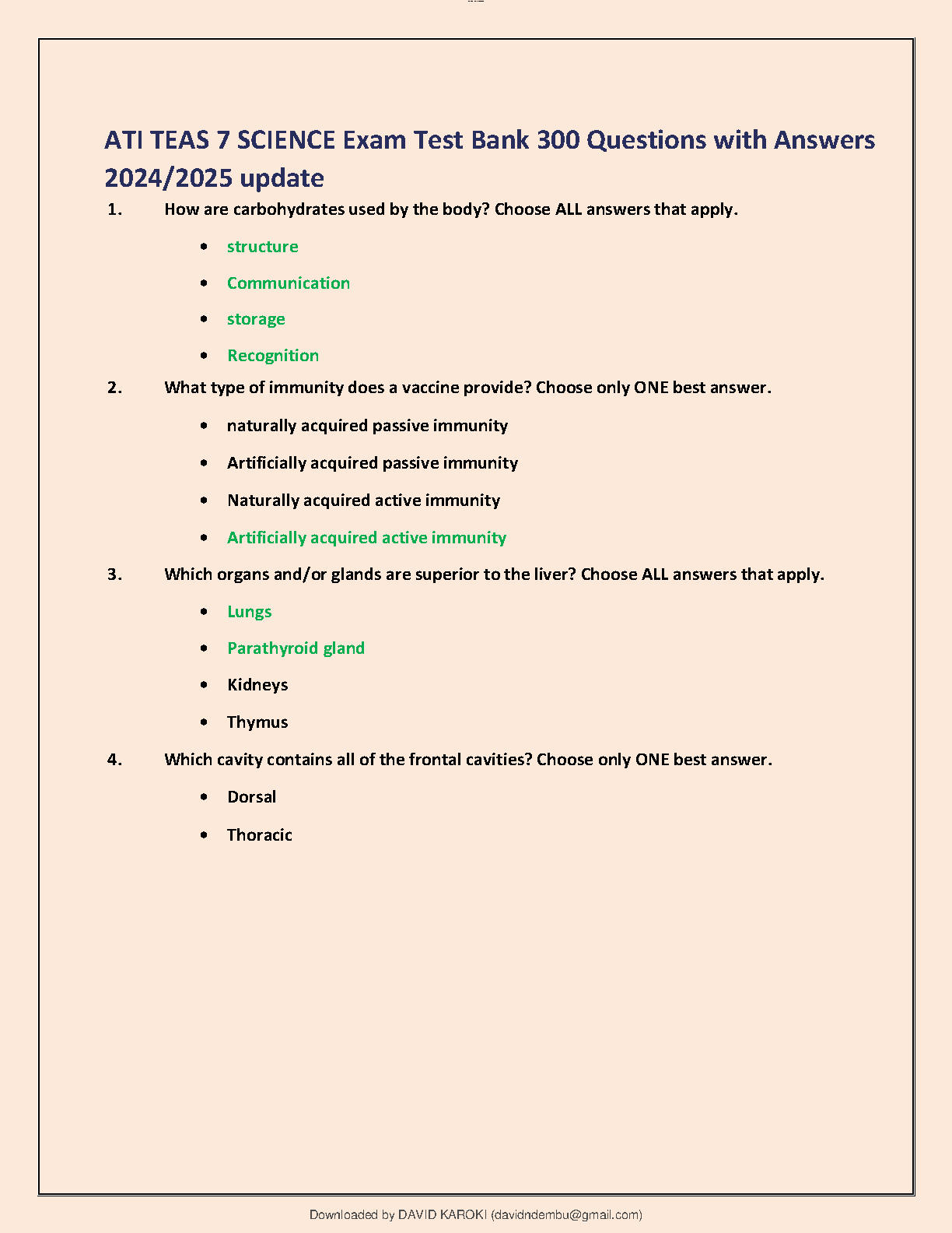 ATI TEAS 7 Science Test Bank: 300 Exam Questions and Correct Answers, 2024-2025 Edition