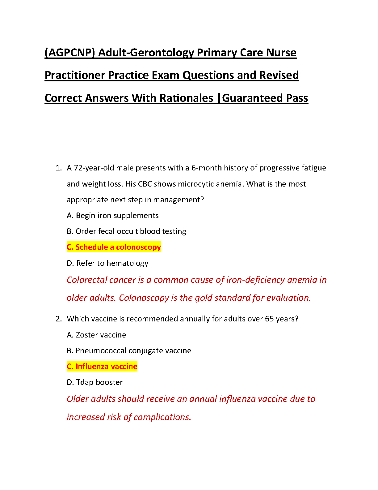 Ace your Adult-Gerontology Primary Care Nurse Practitioner (AGPCNP) certification exam with confidence! This comprehensive test bank for the 2025/2026 academic year is meticulously designed to help you succeed on your first try. It features a vast collection of practice exam questions that mirror the actual test format, each with a detailed rationale explaining the correct answer. Master key clinical concepts, from diagnostics to preventative care, and avoid the stress of resits. This is the ultimate study guide to ensure you pass your AGPCNP boards.