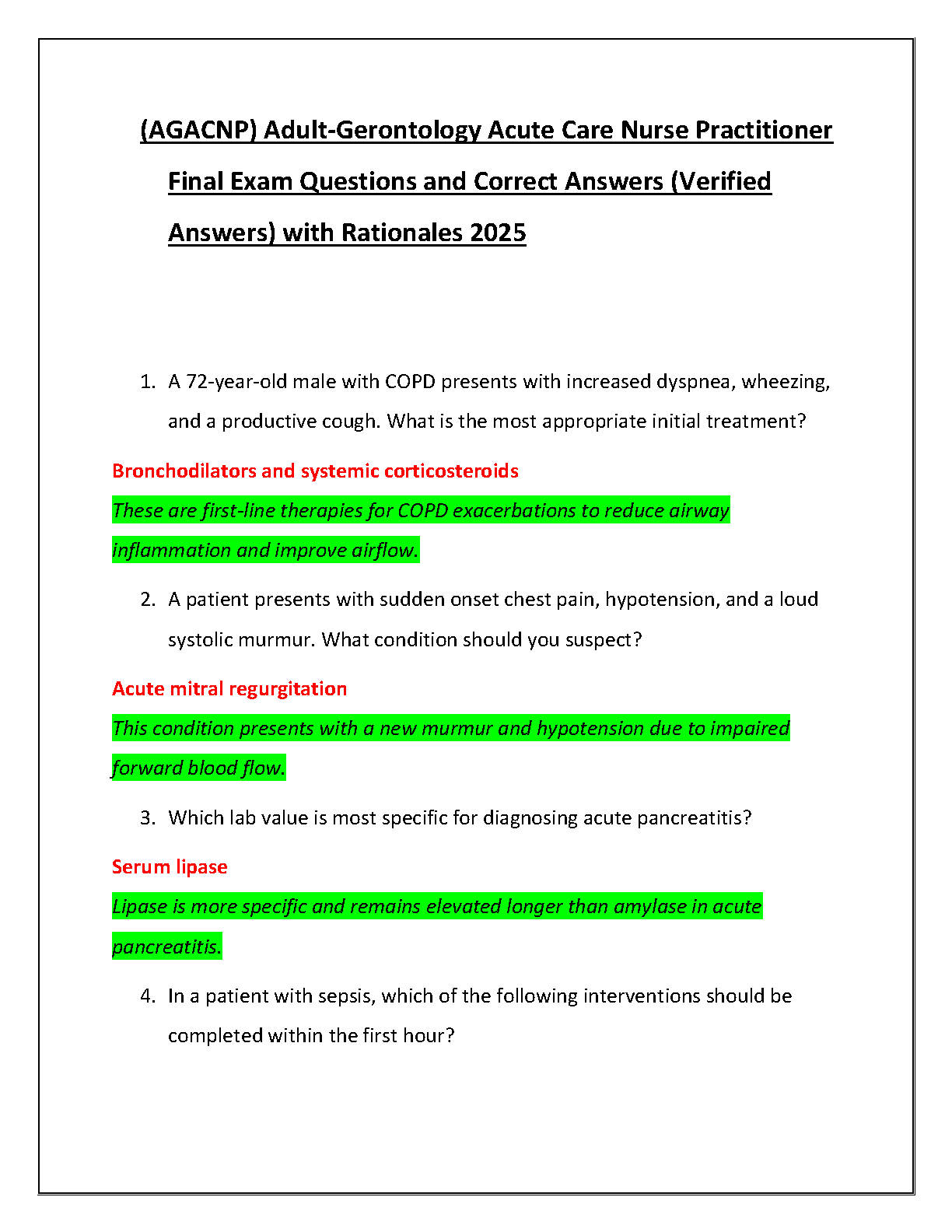 Unlock success in your Adult-Gerontology Acute Care Nurse Practitioner (AGACNP) certification with our premier 2025/2026 Final Exam Test Bank. This essential study guide provides a comprehensive collection of exam-style questions, complete with verified answers and detailed rationales that explain the 'why' behind each correct choice. Dive deep into critical care topics such as managing COPD, identifying acute mitral regurgitation, diagnosing pancreatitis, and initial sepsis interventions. This resource is meticulously designed to mirror the actual exam, giving you the confidence and knowledge needed to pass on your very first try and avoid costly resits. Prepare smarter, not harder, and take the next step in your nursing career.