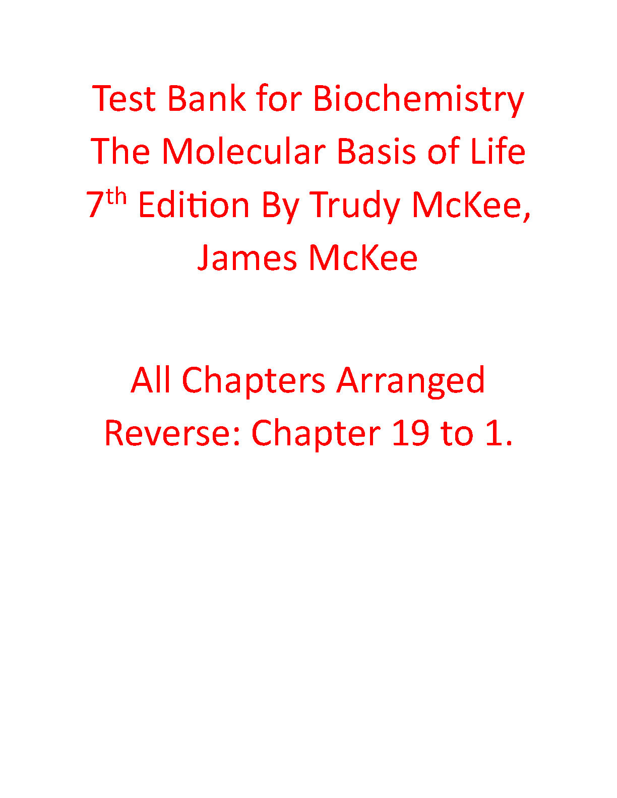 Test Bank for Biochemistry: The Molecular Basis of Life, 7th Edition by Trudy McKee, James R. McKee (All Chapters 1-19)