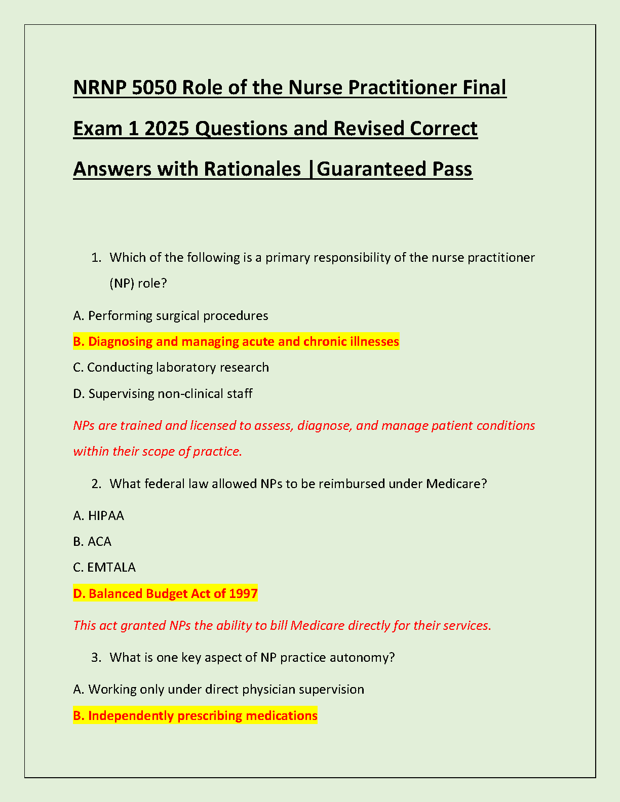 Unlock your full potential and ace your NRNP 5050 final exam on the first attempt with this essential study guide for the 2025/2026 academic year. This resource provides a comprehensive collection of exam questions focused on the 'Role of the Nurse Practitioner,' complete with verified correct answers and in-depth rationales for each. Designed to eliminate guesswork and help you master key concepts, this guide is your ultimate tool to pass with confidence and avoid resits.
