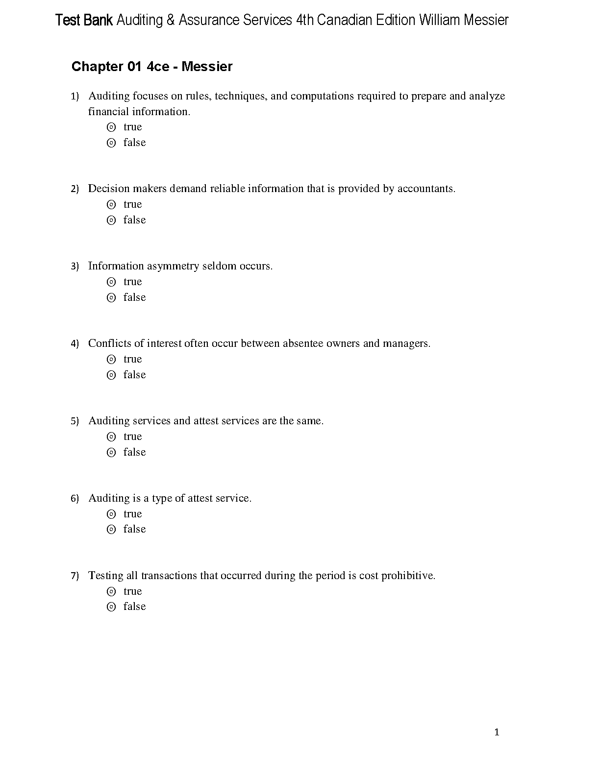 Test Bank for Auditing & Assurance Services, 4th Canadian Edition by William F. Messier Jr., Steven M. Glover, Douglas F. Prawitt, and Peter D. Chant