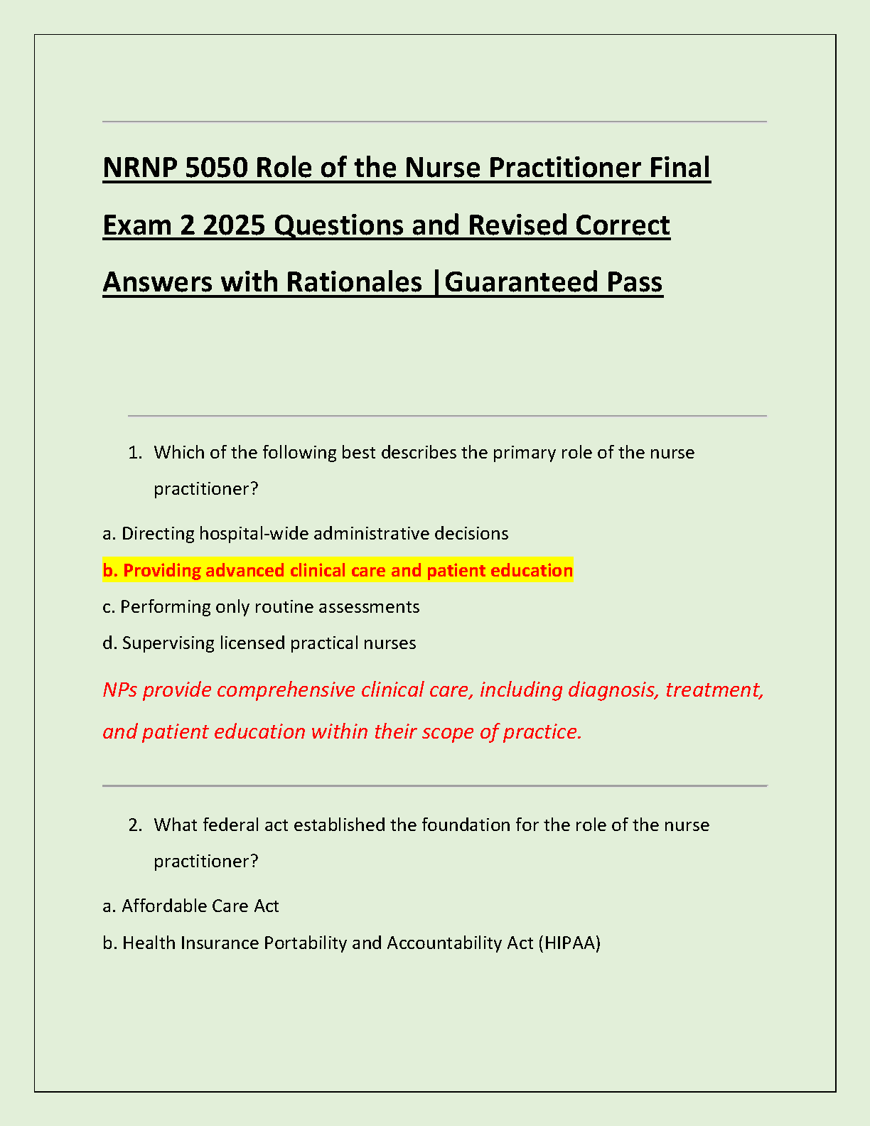 NRNP 5050 Role of the Nurse Practitioner Final Exam 2 Test Bank | 2025/2026 Updated Q&A with Rationales | Guaranteed Pass