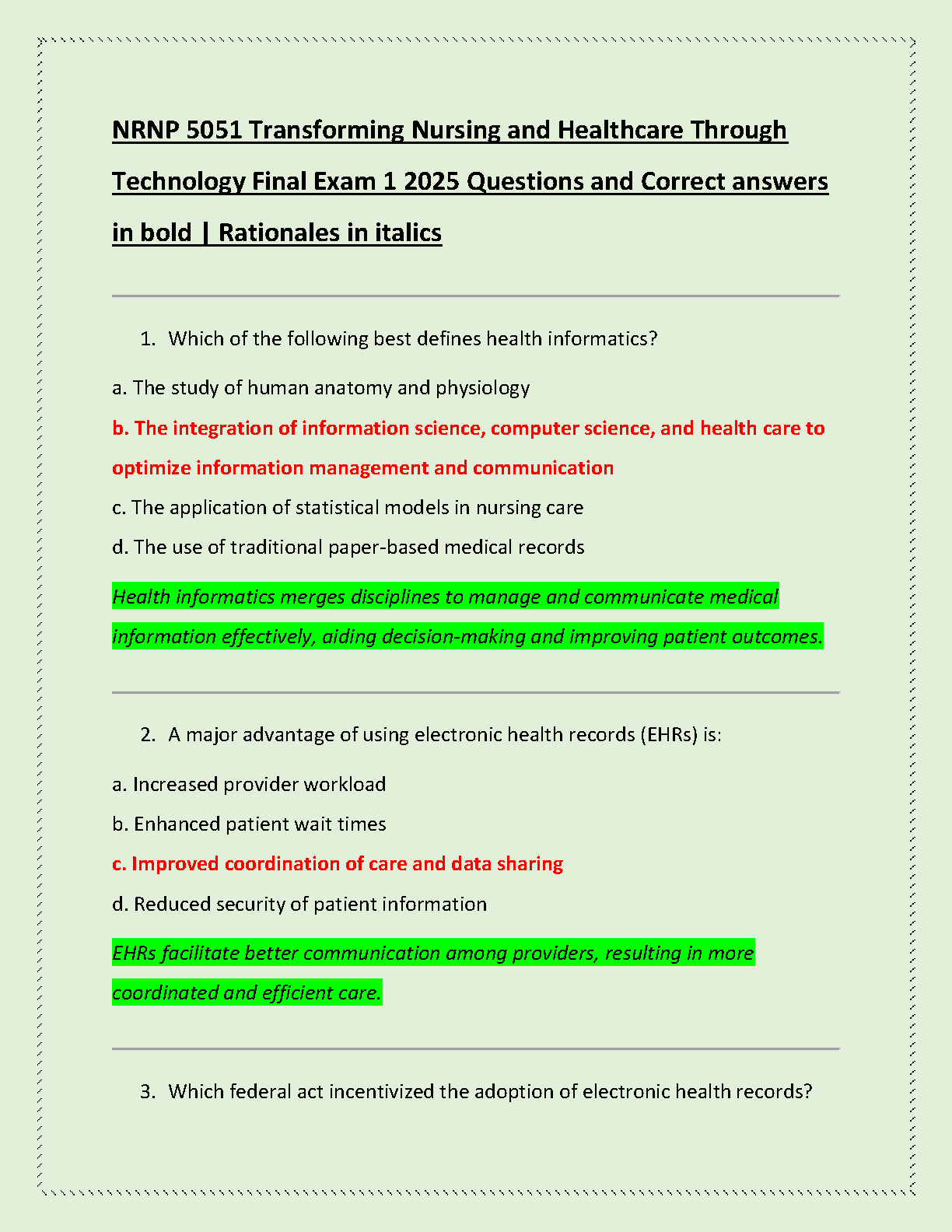 NRNP 5051 Final Exam Test Bank for Transforming Nursing and Healthcare Through Technology, 3rd Edition by Kelley - Verified Questions & Answers with Rationales (Latest 2025 Update)