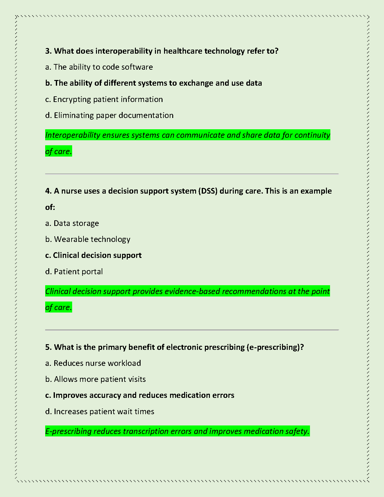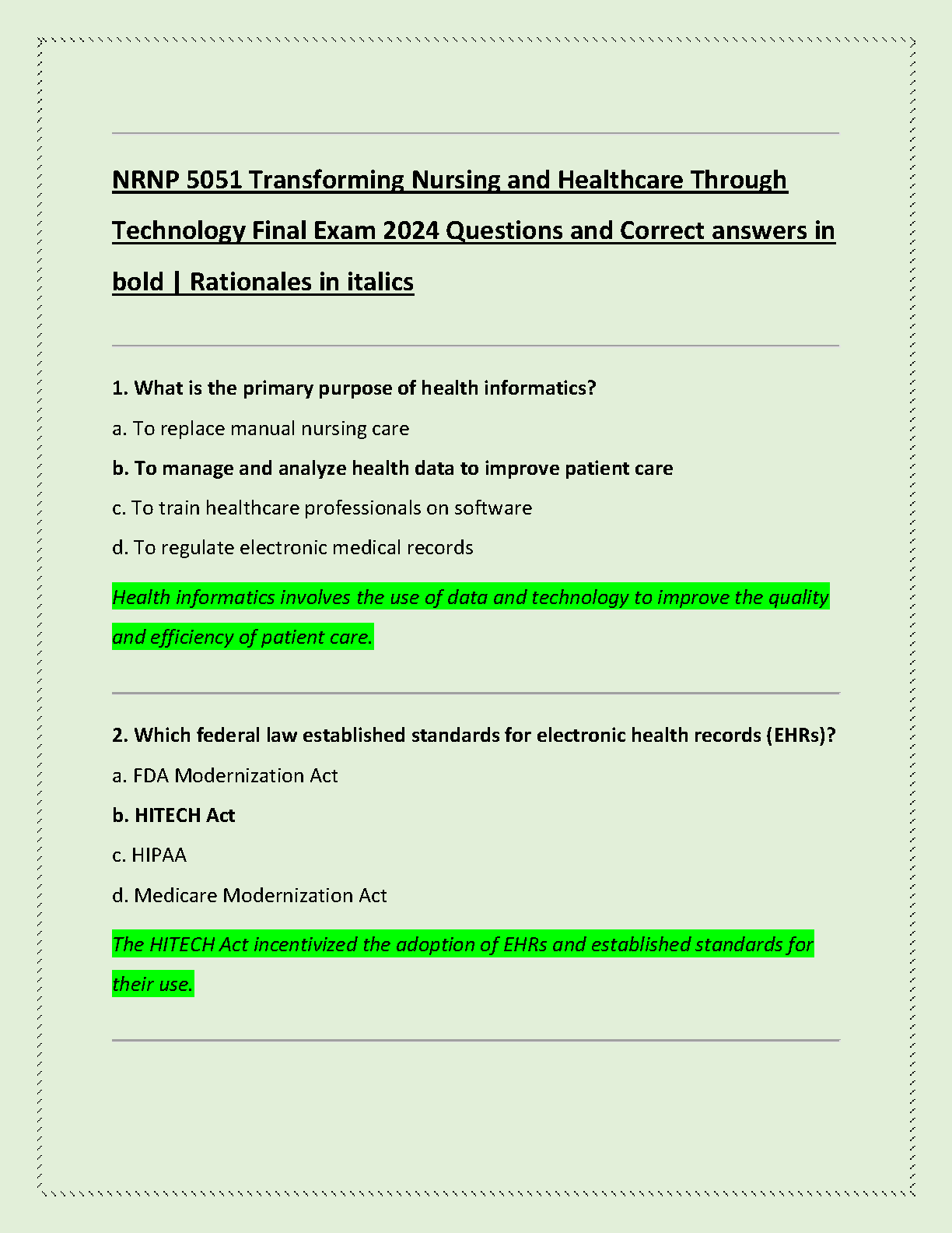 Unlock success in your NRNP 5051 course with our premier 2025/2026 Final Exam resource for 'Transforming Nursing and Healthcare Through Technology'. This comprehensive study guide features an extensive bank of exam-style questions, each complete with verified answers and in-depth rationales to ensure a thorough understanding. Designed to clarify complex topics in health informatics, this material is the ultimate tool to study efficiently, boost your confidence, and pass your final exam on the very first try. Say goodbye to exam anxiety and avoid resits by preparing with the most accurate and up-to-date content.