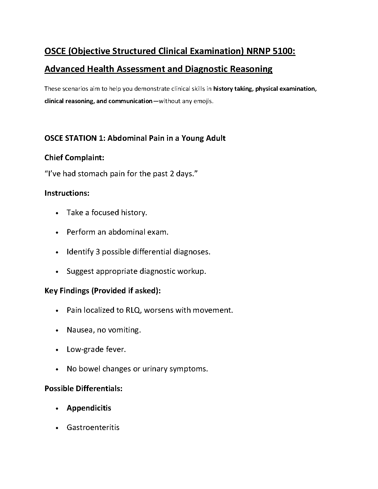 Get ready to master your NRNP 5100 OSCE with our comprehensive 2025/2026 study guide. This resource provides detailed scenarios, including the 'Abdominal Pain in a Young Adult' station, to sharpen your skills in advanced health assessment and diagnostic reasoning. Practice taking a focused history, performing physical examinations, identifying differential diagnoses, and suggesting appropriate workups. This guide is expertly designed to help you demonstrate clinical competence and pass your exams confidently on the first attempt, eliminating the need for resits.