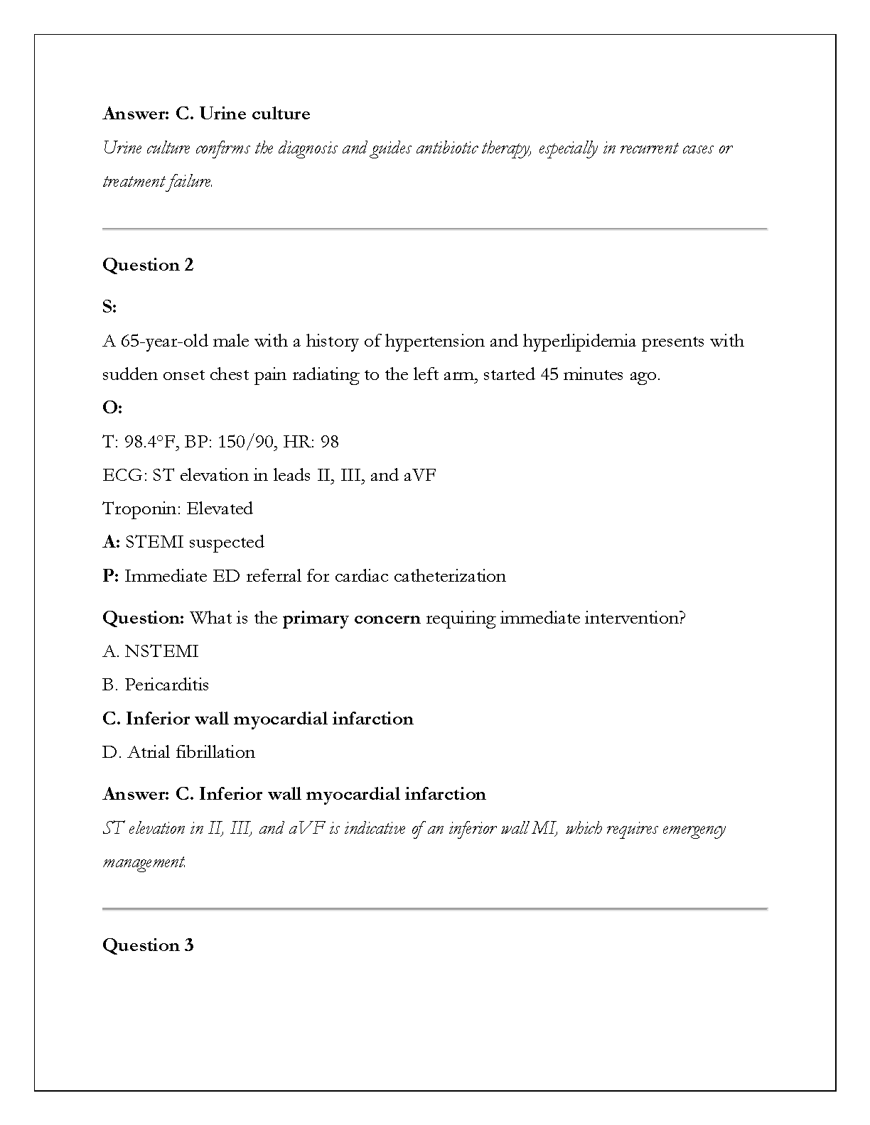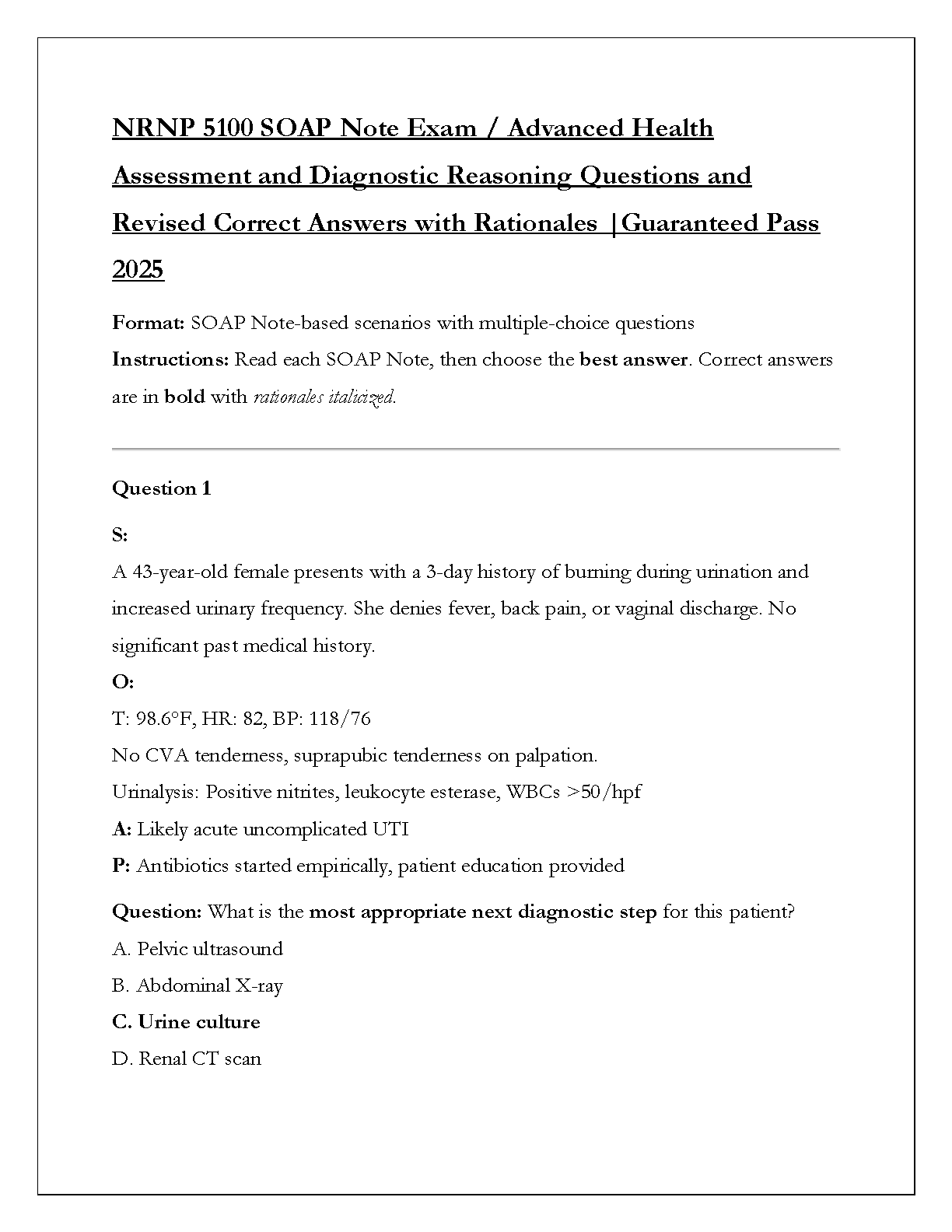 Master your NRNP 5100 course with this comprehensive 2025 SOAP Note Exam guide. This premium resource focuses on Advanced Health Assessment and Diagnostic Reasoning, providing a complete set of scenario-based questions with detailed, correct answers and in-depth rationales. Each question is designed to mirror the actual exam format, helping you build confidence and master the critical thinking skills needed to excel. Ace your exam on the first try and solidify your understanding of clinical decision-making with this essential study tool.