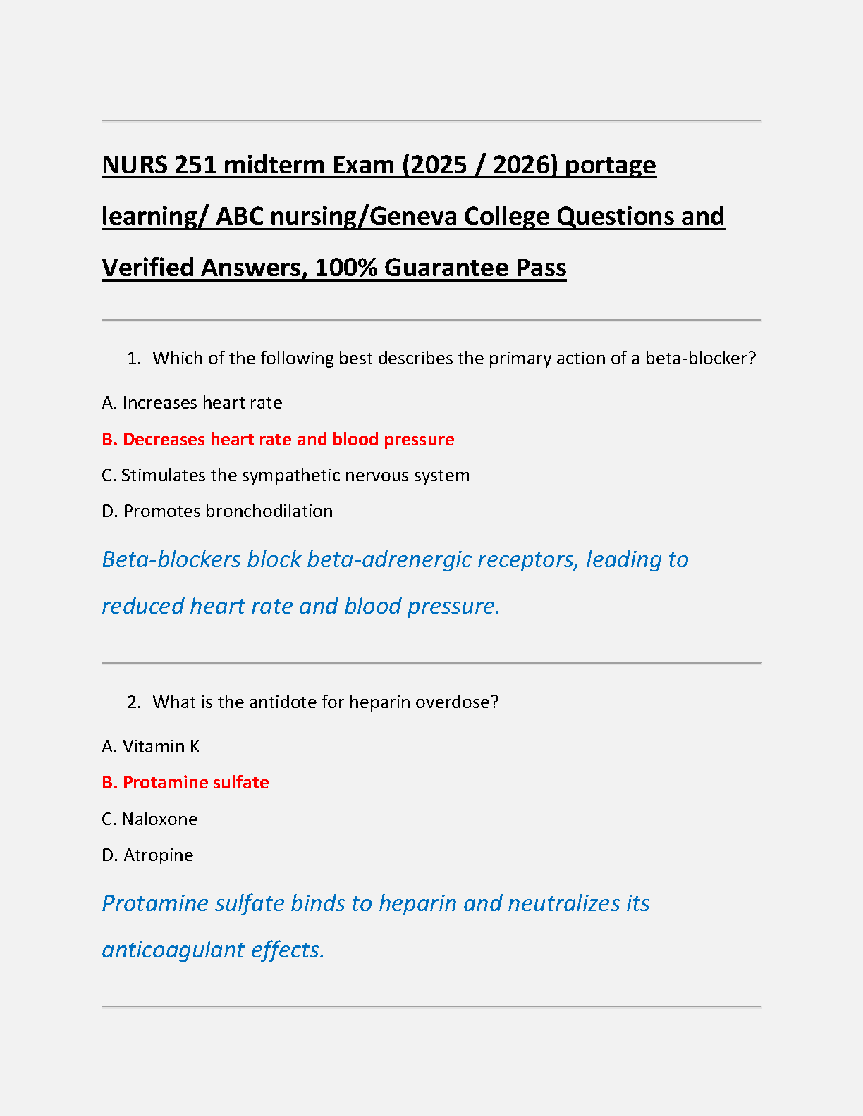Ace your NURS 251 Midterm with this newly released 2025/2026 test bank from Portage Learning/ABC Nursing/Geneva College. This comprehensive study guide features a complete set of exam questions with 100% verified answers and detailed rationales. Master key nursing concepts, eliminate exam stress, and ensure you pass on your first attempt, avoiding costly resits. This is the ultimate resource for achieving a top grade in your nursing course.