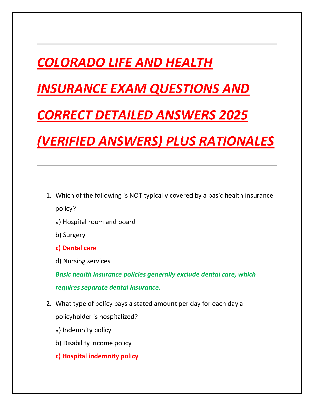 Ace your Colorado Life and Health Insurance licensing exam with confidence! This comprehensive test bank for the 2025/2026 academic year is meticulously designed to ensure your success. It features a vast collection of exam-style questions, each accompanied by a correct, verified answer and a detailed rationale. Understanding the 'why' behind each answer is crucial for deep learning and will empower you to tackle any question the actual exam throws at you. Avoid the stress and cost of resits. Master the essential concepts and walk into your exam prepared to pass on the very first try!