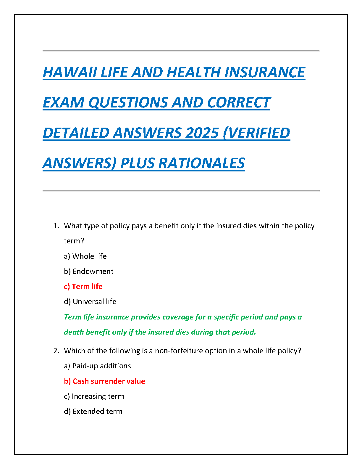 Hawaii Life and Health Insurance License Exam Prep 2025 - Test Bank with Verified Questions, Answers, and Rationales