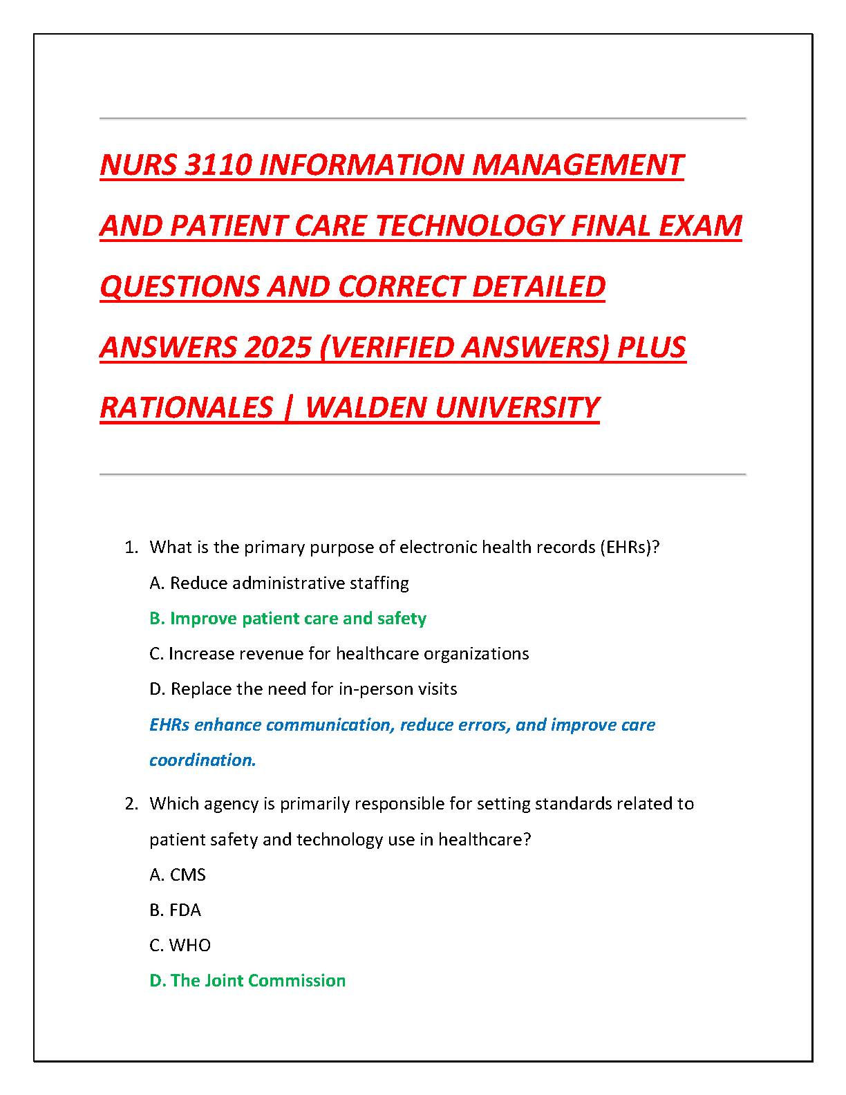 Test Bank for NURS 3110 Information Management and Patient Care Technology - Final Exam 2025 | Walden University | Questions & Rationales