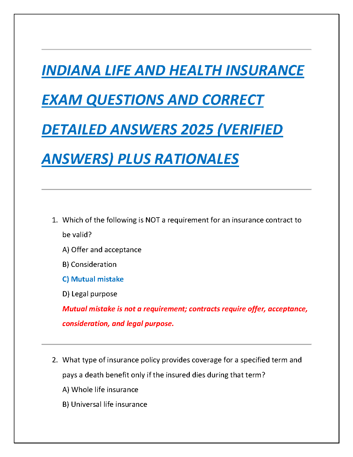 Indiana Life and Health Insurance Exam Test Bank 2025 Edition | Questions, Verified Answers & Rationales
