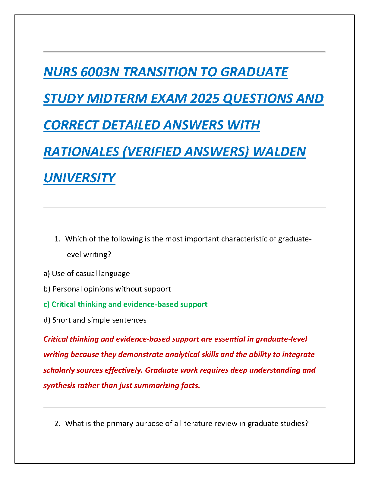 Master the NURS 6003N Midterm Exam at Walden University with our comprehensive test bank for 2025. This essential study guide features a wide range of questions covering all key topics in 'Transition to Graduate Study.' Each question is accompanied by a correct, verified answer and a detailed rationale to deepen your understanding. Prepare efficiently, build confidence, and achieve top grades with this must-have resource.