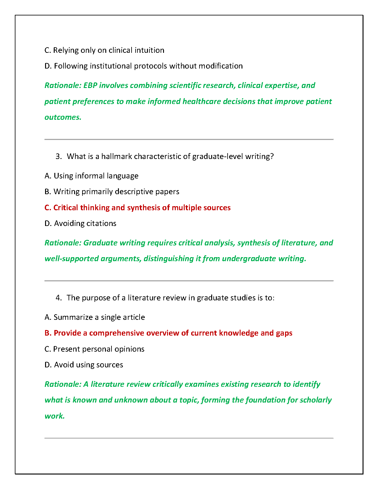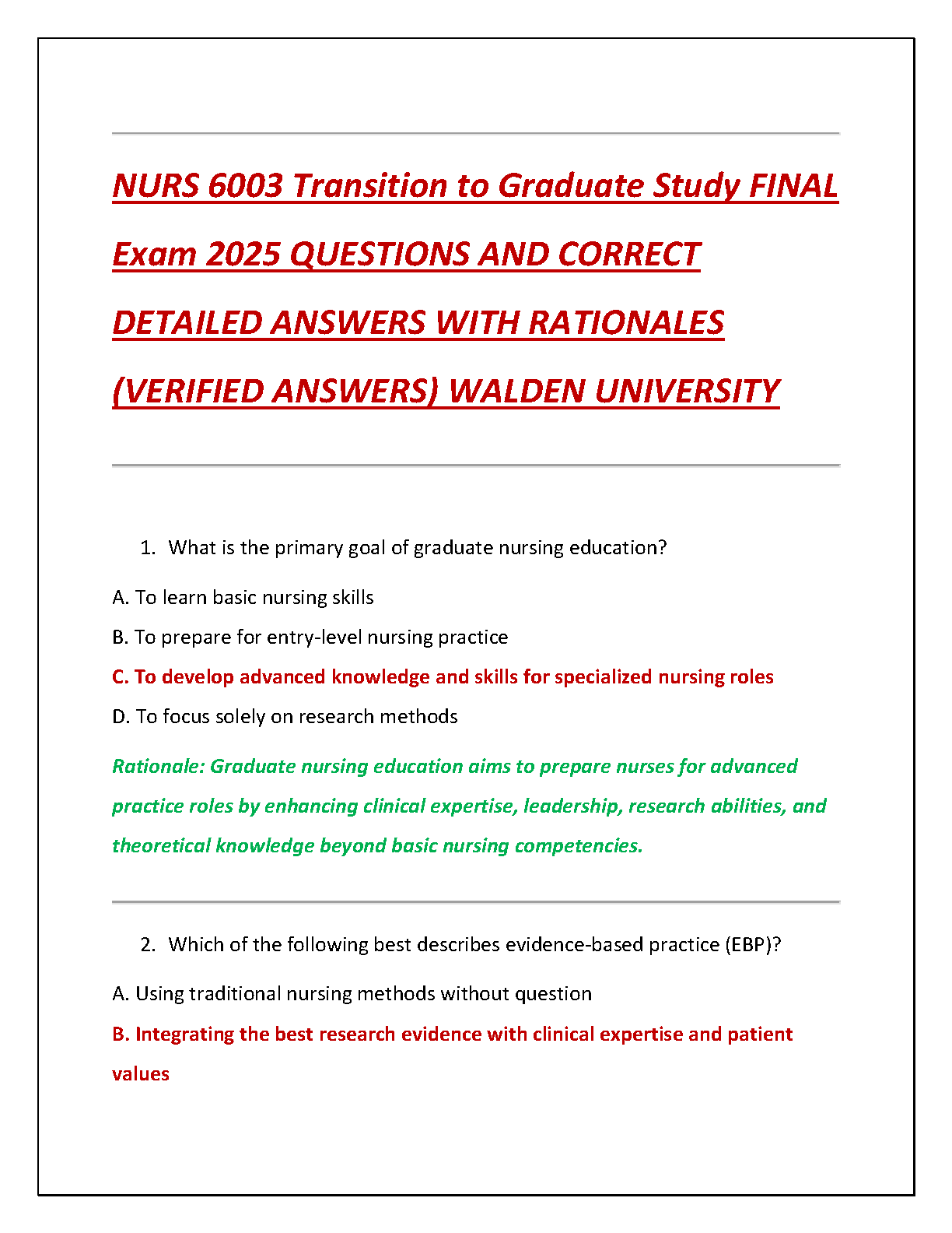 Master your NURS 6003 Final Exam at Walden University with this comprehensive test bank for 'Transition to Graduate Study'. This resource is expertly designed to help you succeed on your first attempt, eliminating the need for resits. It features a complete set of 2025 exam questions, accompanied by verified, correct answers and in-depth rationales that clarify complex concepts. Aligned with the core curriculum, this study guide provides the ultimate preparation tool for a seamless transition into graduate-level nursing studies. Download now to gain the confidence and knowledge needed to ace your exam.