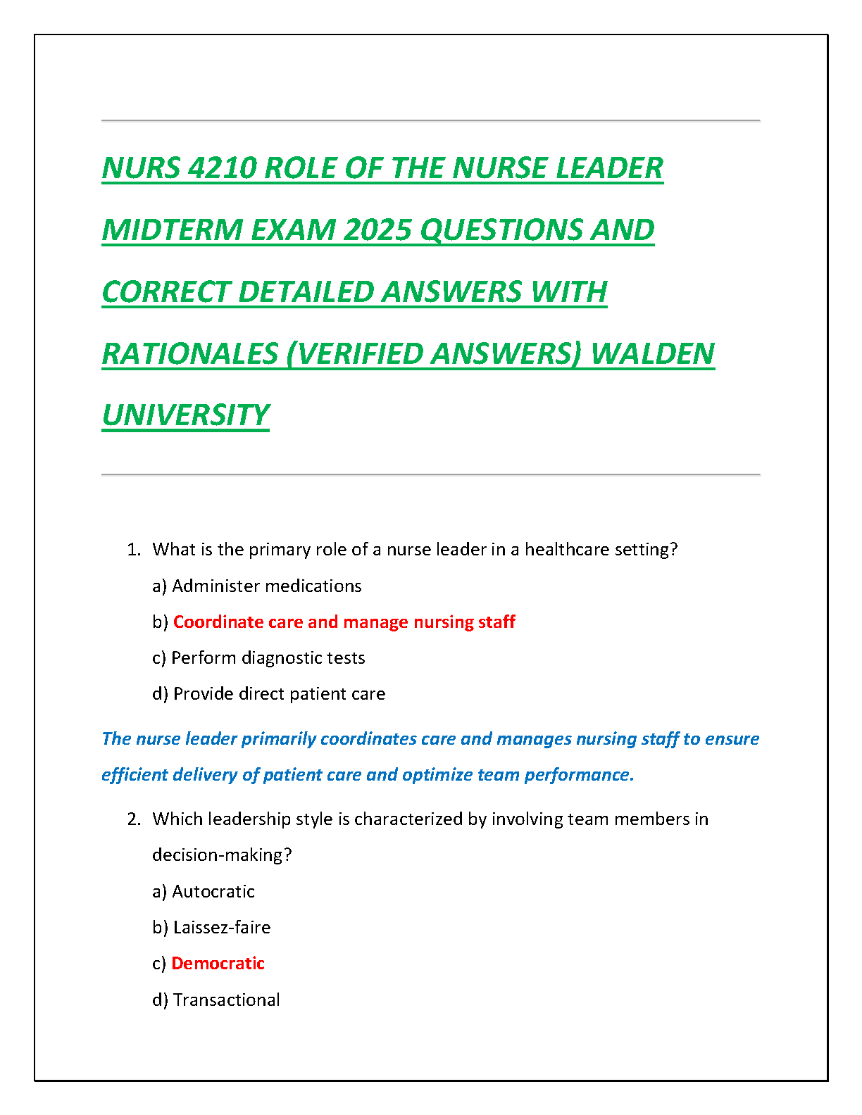 NURS 4210 Role of the Nurse Leader Midterm Exam Test Bank 2025/2026 with Verified Questions, Correct Answers, and Detailed Rationales | Walden University