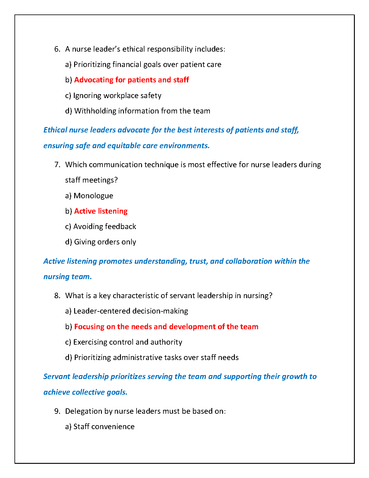 Ace your NURS 4210 midterm exam at Walden University with this essential test bank for 'Role of the Nurse Leader'. This latest 2025/2026 edition features a complete collection of exam questions paired with 100% correct, verified answers and in-depth rationales. Each rationale breaks down the concepts, ensuring you not only know the right answer but also understand the 'why' behind it. This study guide is expertly designed to help you master key leadership principles, optimize your study time, and pass your exam with confidence on the first try.