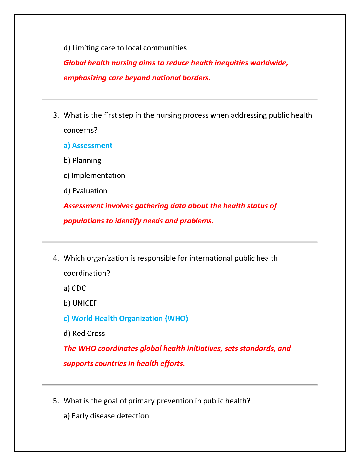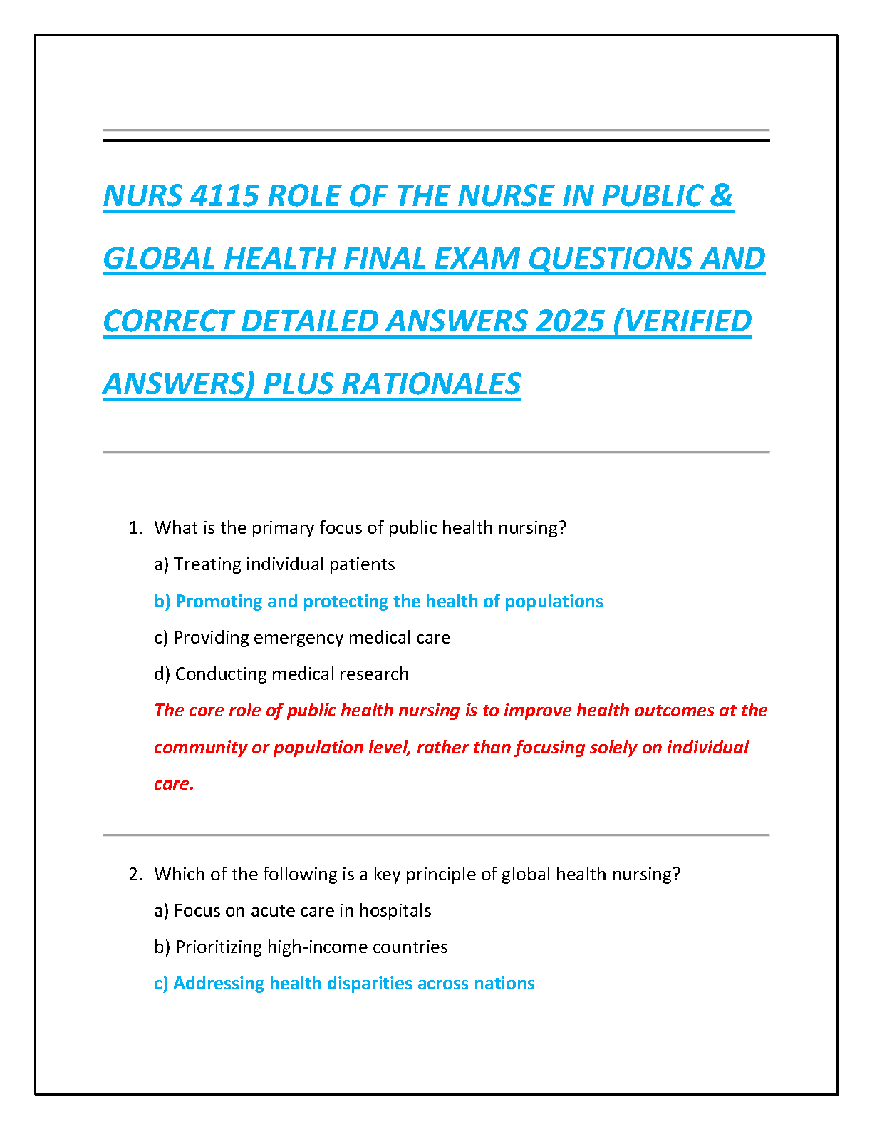 Ace your NURS 4115 final exam with the complete Test Bank for Stanhope and Lancaster's 'Public Health Nursing: Population-Centered Health Care in the Community,' 11th Edition. This essential study resource provides an extensive collection of exam-style questions covering all critical topics in public and global health. Each question comes with a verified, correct answer and a detailed rationale to deepen your understanding of core principles, from promoting population health to addressing global health disparities. Download now to streamline your study process, build confidence, and secure top grades in your course.