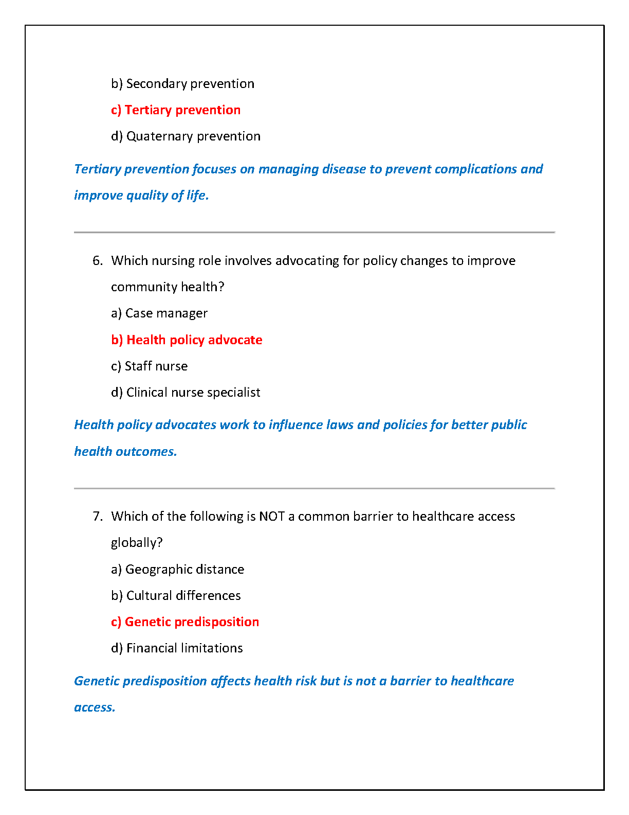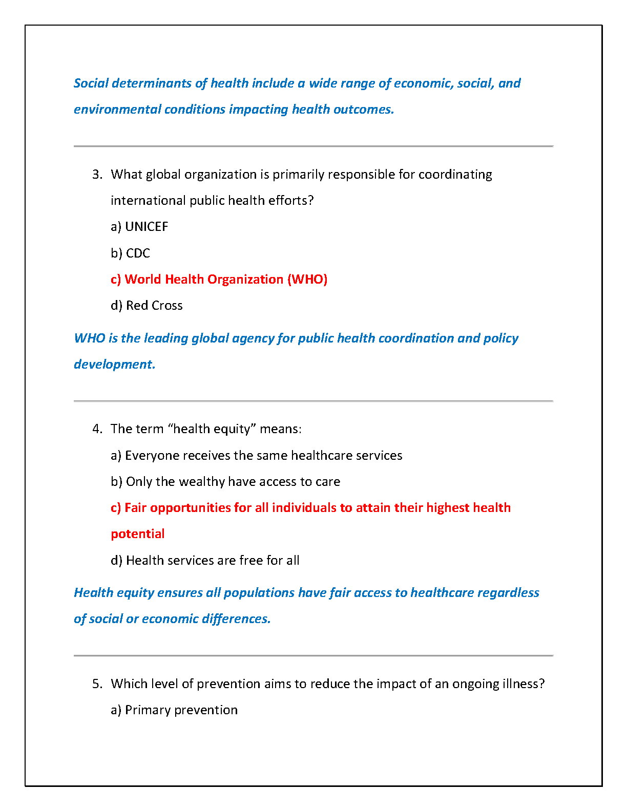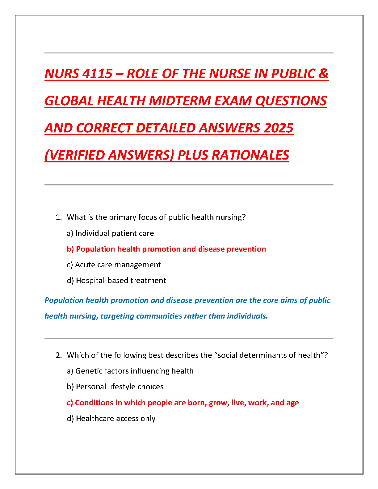 Ace your NURS 4115 Midterm Exam on the first try with our latest 2025/2026 test bank! This comprehensive study guide for 'Role of the Nurse in Public & Global Health' is expertly designed to ensure your success. Inside, you'll find a complete collection of midterm exam questions with 100% correct, verified answers and detailed rationales. This resource helps you master key concepts, understand the reasoning behind each answer, and build the confidence needed to excel. Study smarter, not harder, and pass your exam with flying colors, avoiding any need for resits.