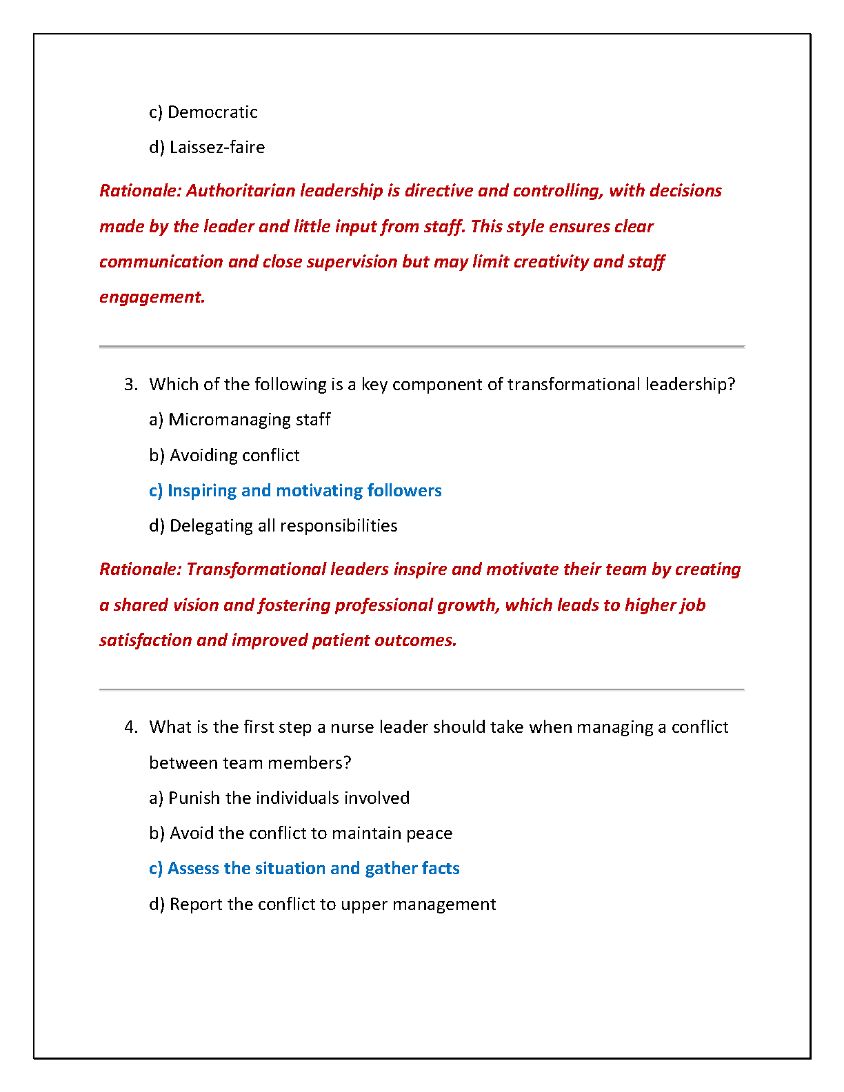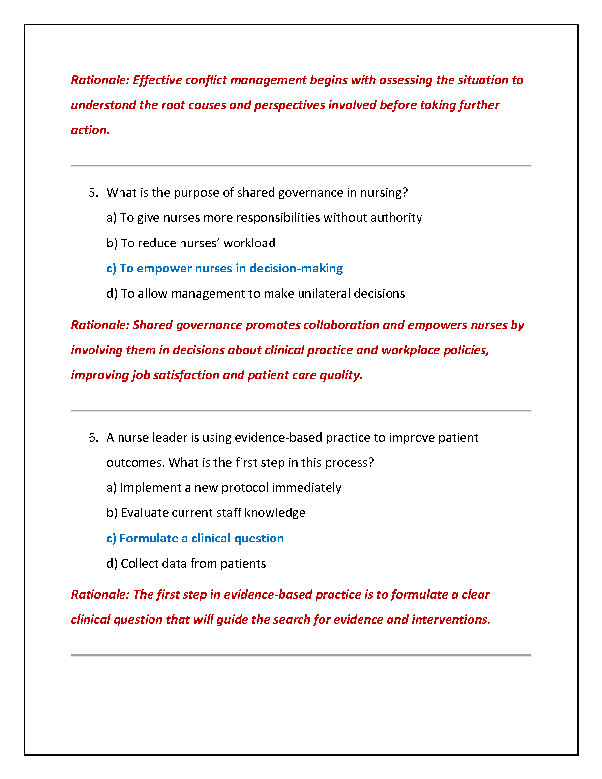Master the complexities of nursing leadership with our comprehensive test bank for NURS 4210: Role of the Nurse Leader. This 2025 updated resource is your ultimate study partner, featuring a wide array of final practice exam questions. Each question comes with a verified, correct answer and an in-depth rationale to clarify core concepts and decision-making processes. Designed to mirror the actual exam format, this test bank will help you build confidence, identify knowledge gaps, and excel in your course. Download now to gain the edge you need for academic success in nursing leadership.