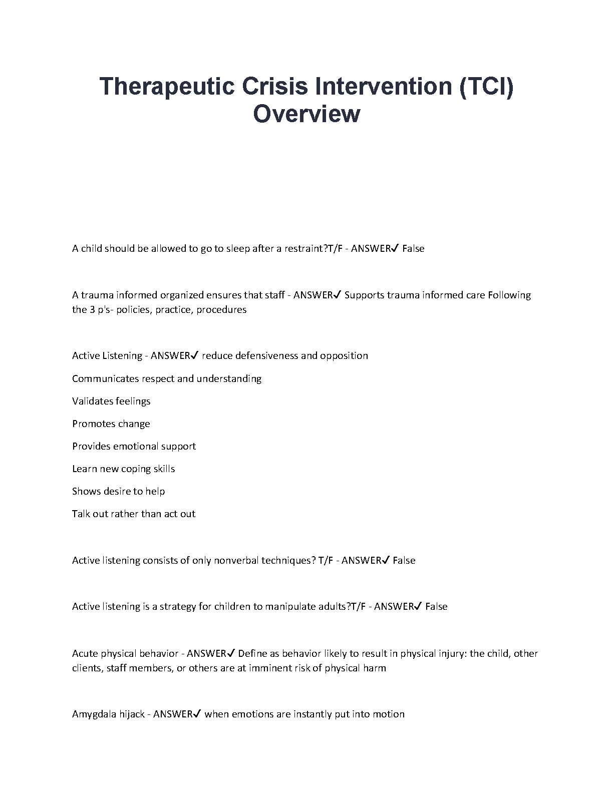 Unlock success in your Therapeutic Crisis Intervention certification with our comprehensive test bank for the TCI System, 7th Edition, developed by Martha J. Holden, Michael A. Nunno, and the Cornell University RCCP. This essential study guide features a complete collection of exam-style questions paired with meticulously verified answers. Master key concepts such as trauma-informed care, active listening, crisis de-escalation, and acute physical behavior. Designed to help you ace your exam on the first try, this resource is your ultimate tool for understanding and applying TCI principles effectively. Download now to start studying smarter and pass with confidence.