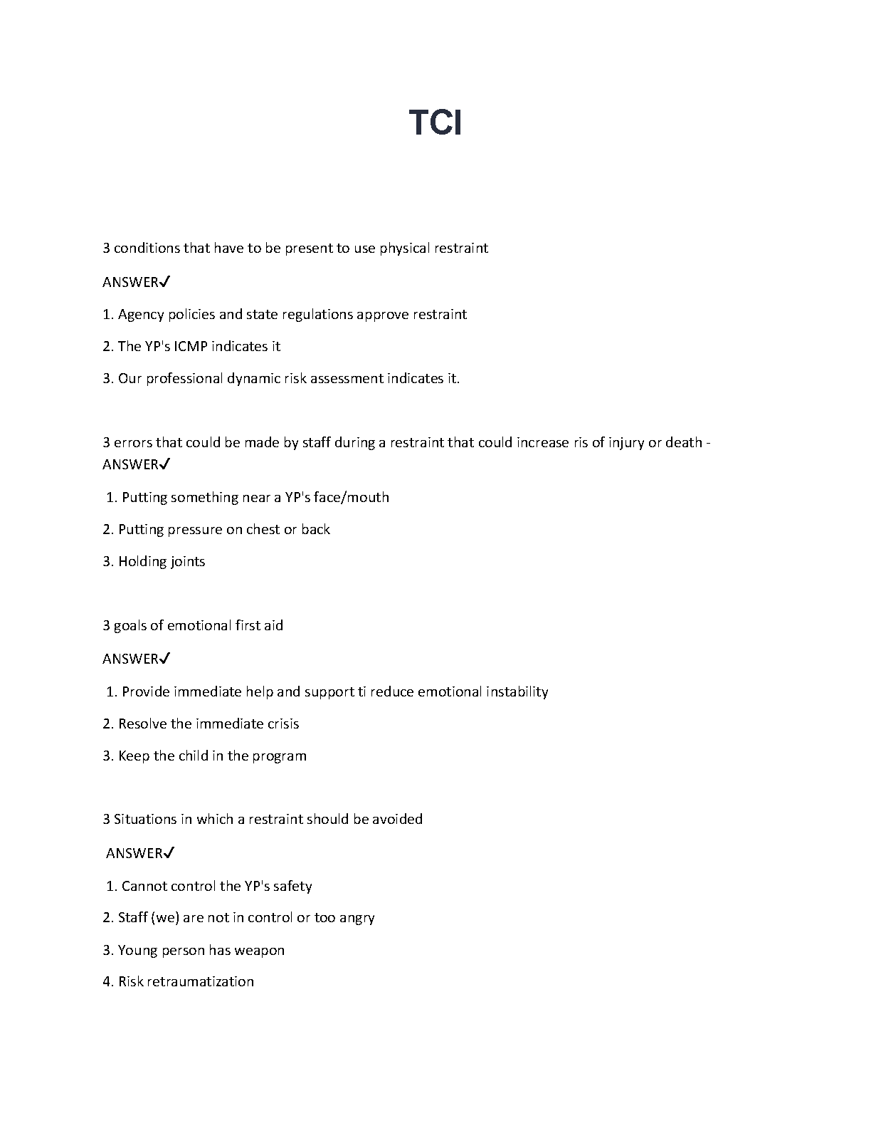 Unlock success in your Therapeutic Crisis Intervention certification with this comprehensive 2025/2026 Q&A study guide. Expertly crafted based on the TCI System, 6th Edition by Martha J. Holden & Michael A. Nunno, this resource is designed to help you pass on your first attempt and avoid resits. It features clear, direct answers to crucial exam questions, covering key areas such as the necessary conditions for using physical restraint, critical errors to avoid, the goals of emotional first aid, and situations where restraint is inappropriate. Prepare effectively and confidently with these essential exam elaborations.