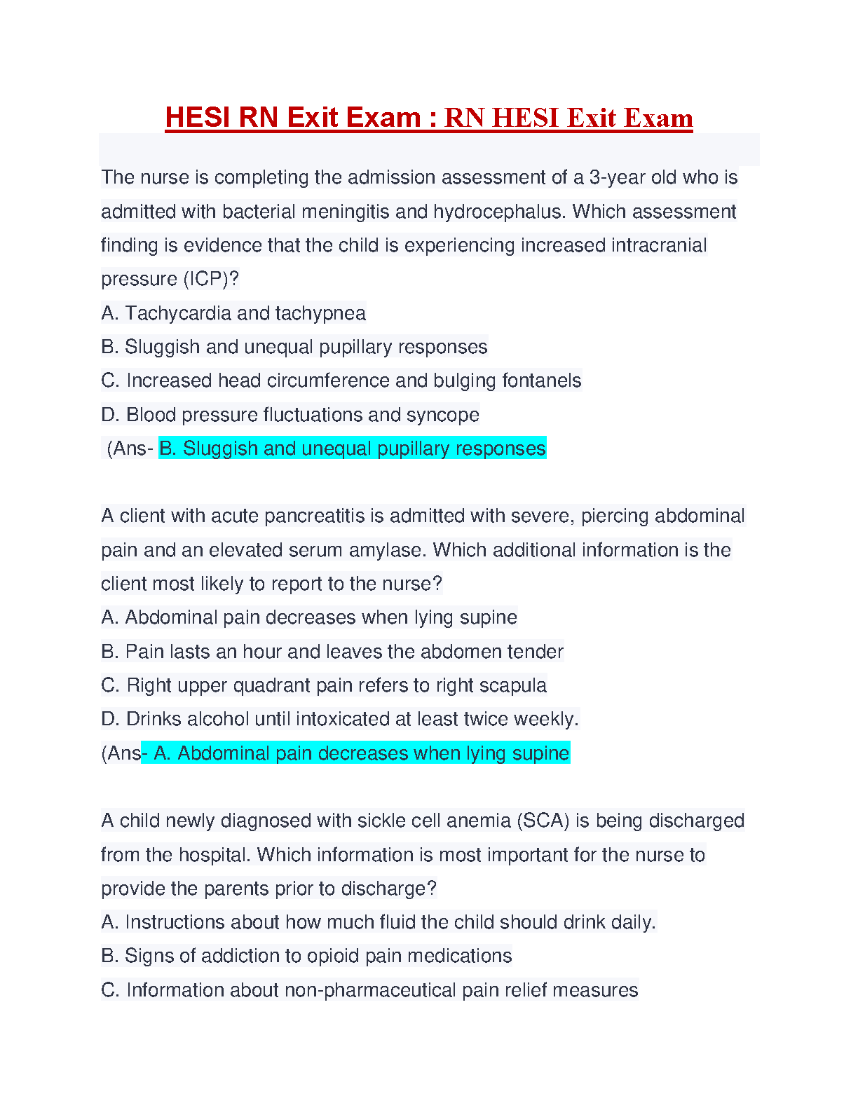 Unlock your potential and ace the HESI RN Exit Exam with our latest 2025/2026 test bank. This comprehensive study guide is packed with practice questions and verified answers covering critical nursing concepts, just like the ones seen in the attached sample. Designed to mirror the actual exam format, this resource is your ultimate tool for effective preparation. Master key topics, build confidence, and ensure you pass on your first attempt, avoiding costly and stressful resits. Get immediate access to the study materials that will pave your way to becoming a Registered Nurse.