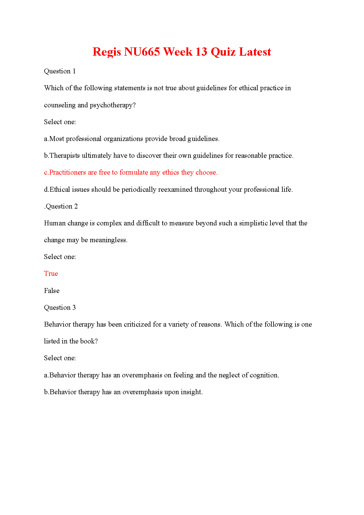 Ace your Regis NU665 Week 13 coursework with our comprehensive and latest quiz test bank. This essential study guide provides detailed questions and verified answers covering key topics in psychotherapy, including ethical guidelines for practice and critical perspectives on behavior therapy. Designed specifically for students in the Psychotherapy with Individuals course, this resource helps you grasp complex concepts and prepare effectively for your exams. Download now to boost your understanding and secure top grades.