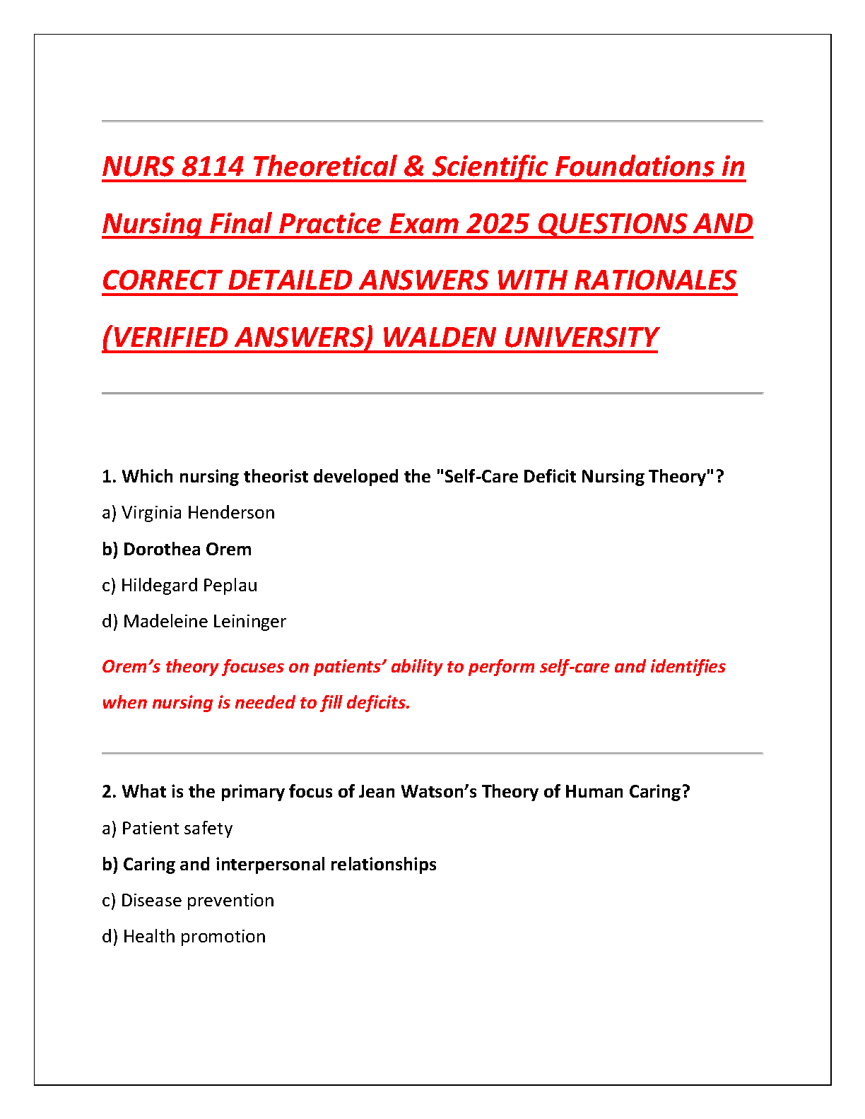 Get the ultimate study guide for your NURS 8114 Theoretical & Scientific Foundations in Nursing final exam at Walden University. This newly released 2025/2026 test bank is designed to help you ace the exam on your first attempt. It provides a complete set of practice questions, verified answers, and detailed rationales that clarify complex nursing theories and concepts. Prepare effectively, build confidence, and avoid resits with this essential resource.