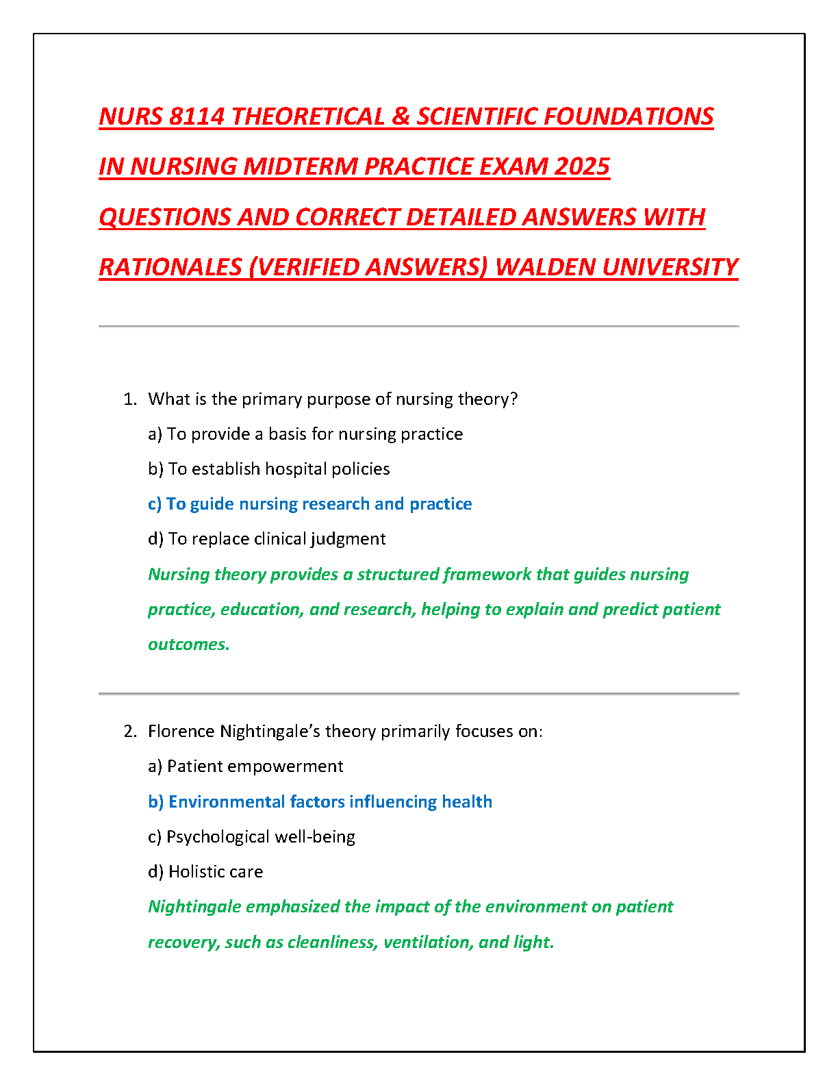 Ace your NURS 8114 Midterm Exam at Walden University with this comprehensive practice exam for the 2025 academic year. This essential study guide provides a complete set of practice questions covering 'Theoretical & Scientific Foundations in Nursing'. Each question comes with a verified, correct answer and a detailed rationale to deepen your understanding of core concepts like nursing theory and the principles of Florence Nightingale. This resource is expertly designed to help you prepare effectively, build confidence, and pass your exam on the first attempt, avoiding costly resits. Get immediate access to the materials and start your successful exam preparation today!