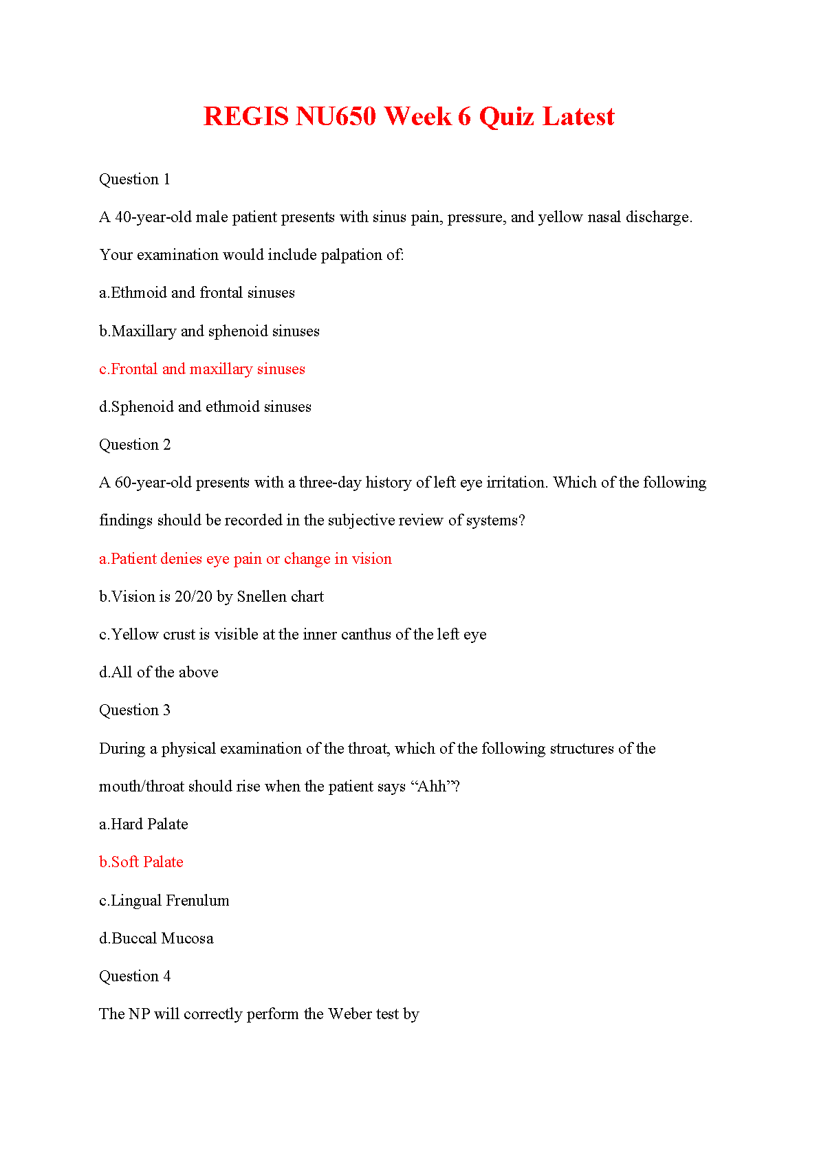 REGIS NU650 Week 6 Quiz Latest Test Bank | Advanced Health Assessment Exam Questions and Answers