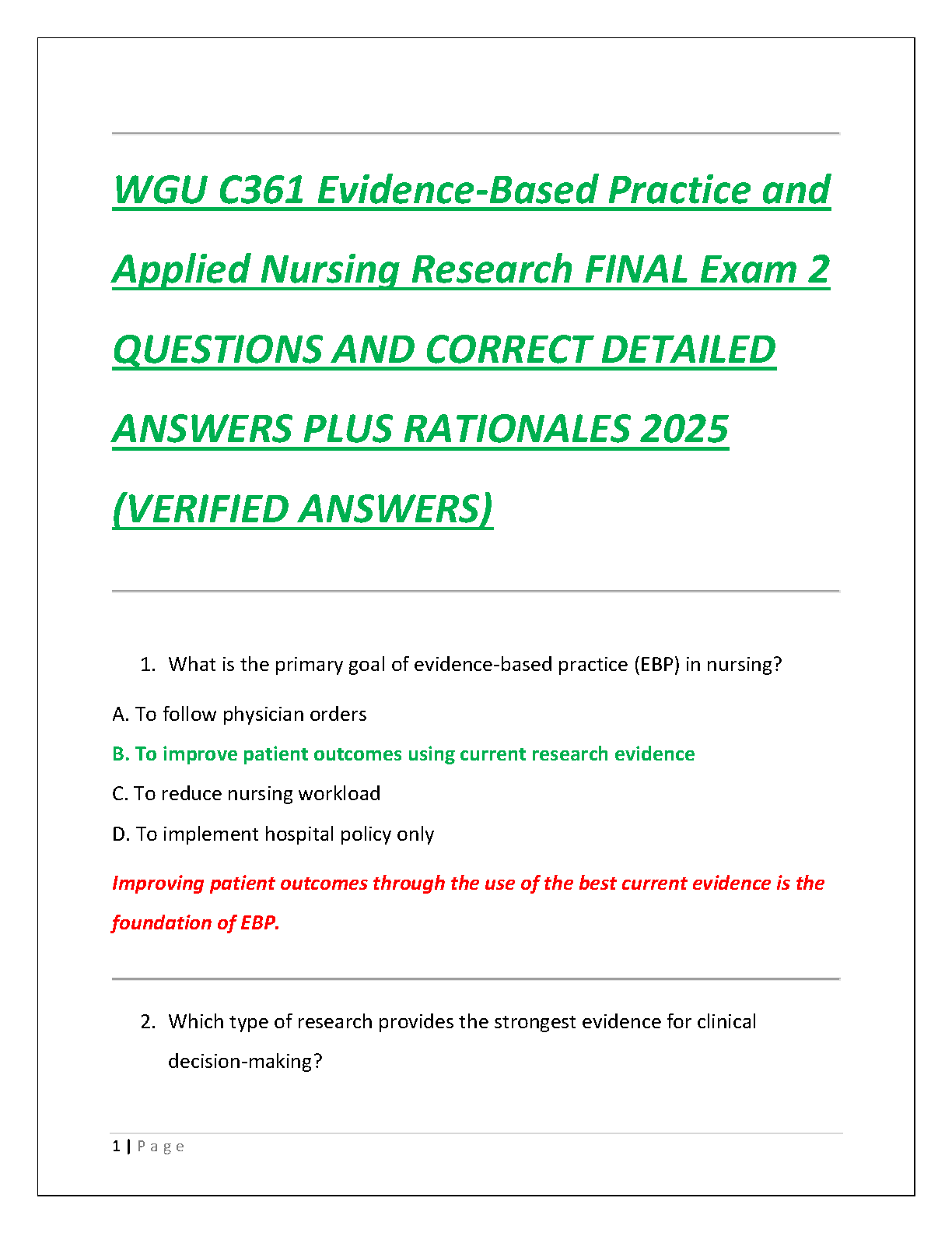 WGU C361 Evidence-Based Practice & Applied Nursing Research Final Exam 2 Test Bank | 2025/2026 Verified Q&A with Rationales to Ace Your Exam