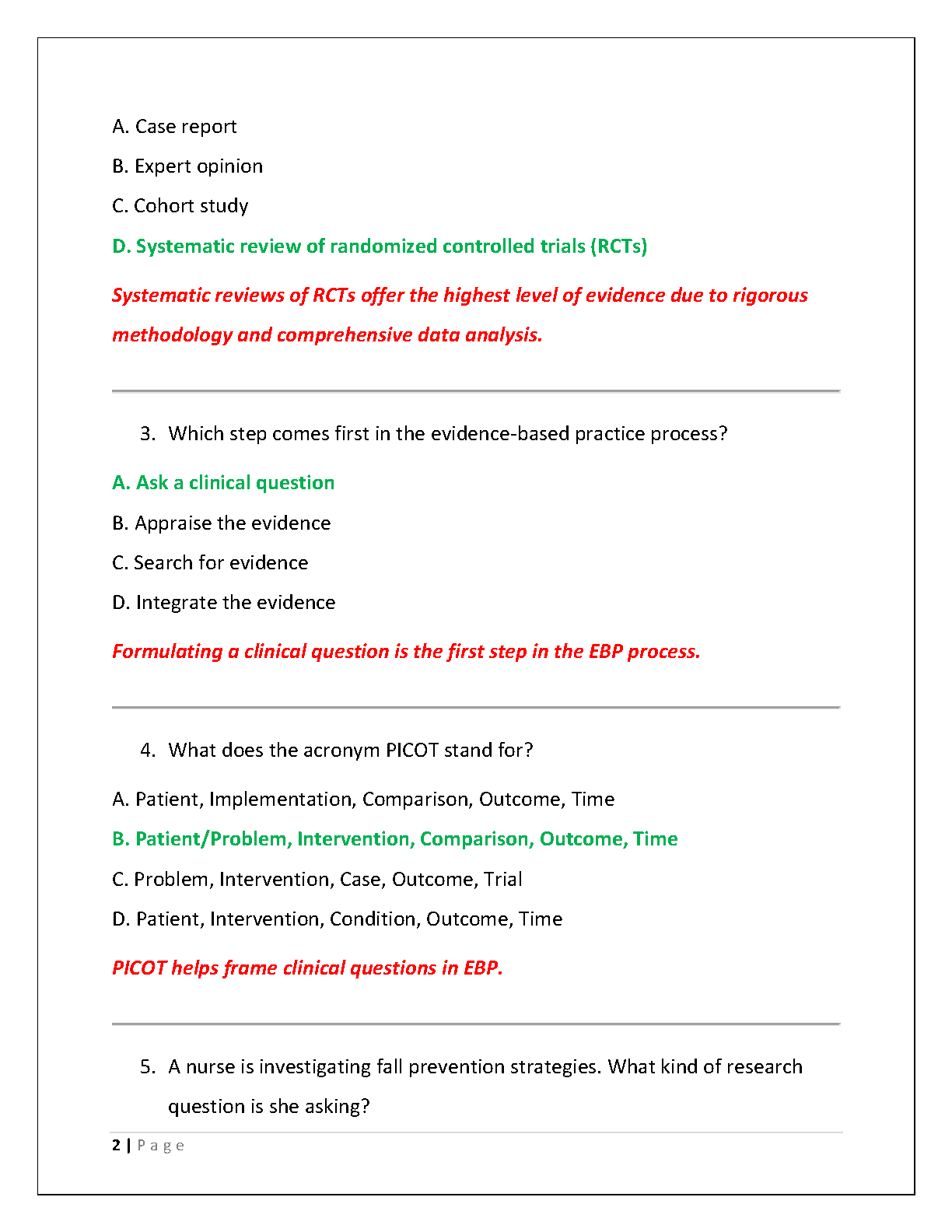 Prepare to excel in your WGU C361 Final Exam 2 with our latest and most comprehensive test bank for the 2025/2026 academic year. This resource is meticulously crafted to help you master the core concepts of Evidence-Based Practice and Applied Nursing Research. Inside, you'll find an extensive collection of exam-style questions, each accompanied by a verified correct answer and a detailed rationale. These rationales are key to not just memorizing, but truly understanding the material, ensuring you're fully prepared to tackle any question on the exam. Stop worrying about resits and secure your success on the first attempt with this essential study guide.