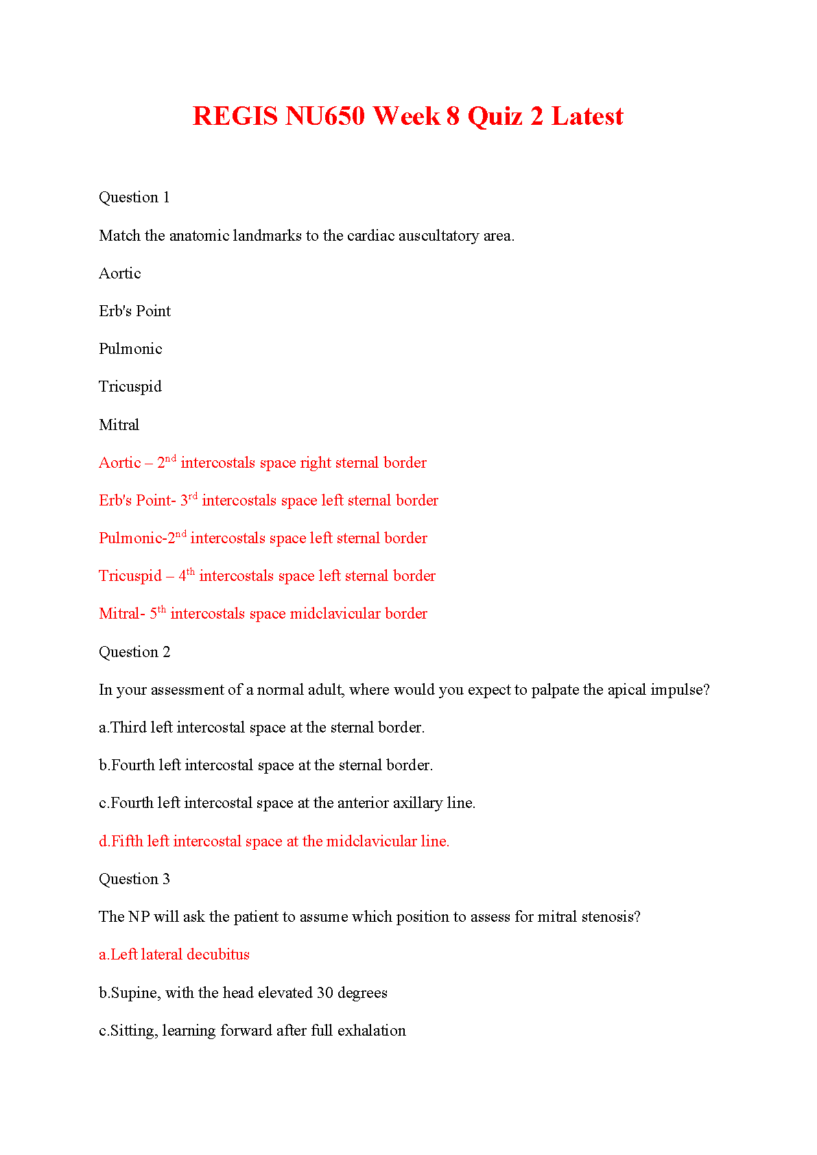 NU650 Week 8 Quiz 2 Study Guide (Regis) | Verified Answers for 2025/2026 | Ace Your Cardiac Assessment Exam