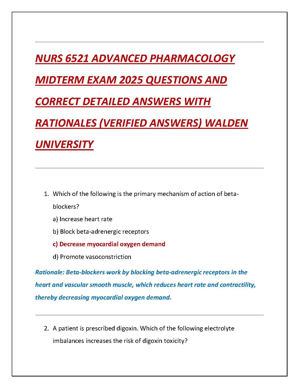 Excel in your NURS 6521 Advanced Pharmacology course at Walden University with this comprehensive test bank for the 2025 Midterm Exam. This essential study resource provides a complete set of questions, each accompanied by a correct, verified answer and a detailed rationale. The in-depth explanations help you understand the core principles behind each pharmacological concept, ensuring you're not just memorizing, but truly learning the material. Prepare with confidence, master complex topics, and achieve top grades on your midterm.