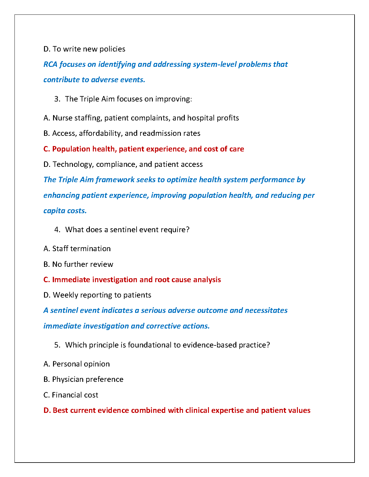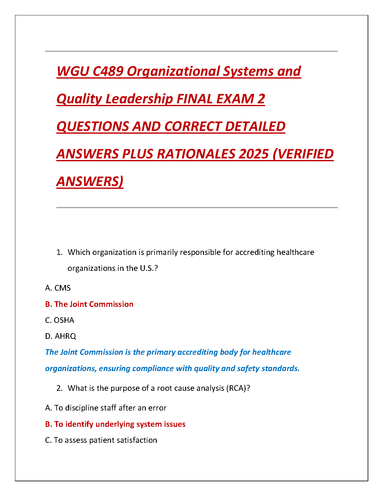Ace your WGU C489 final exam with our comprehensive test bank for the 2025/2026 academic year. This essential study guide covers all key topics in Organizational Systems and Quality Leadership. It features a complete set of final exam questions, each with a verified correct answer and a detailed rationale to explain the underlying concepts. This resource is expertly designed to help you master the material, build confidence, and pass your exam on the first try. Get the verified answers and explanations you need to succeed in C489.