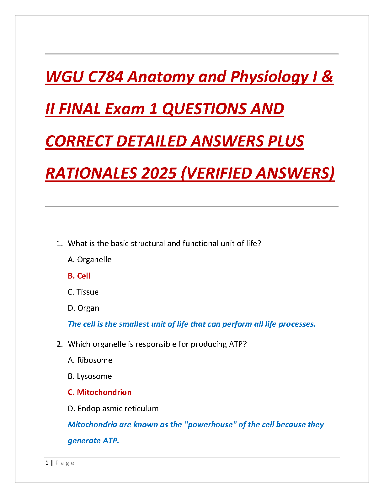 Unlock success in your WGU C784 Anatomy and Physiology I & II final exam with our ultimate study resource for the 2025/2026 academic year. This comprehensive test bank provides a complete set of questions from Final Exam 1, each with verified, correct answers and in-depth rationales. Move beyond simple memorization and truly understand the core concepts. Our expertly crafted guide is designed to help you master the material, build confidence, and pass your exam on the very first attempt, eliminating the need for costly and stressful resits. Get the edge you need to excel in your studies today!