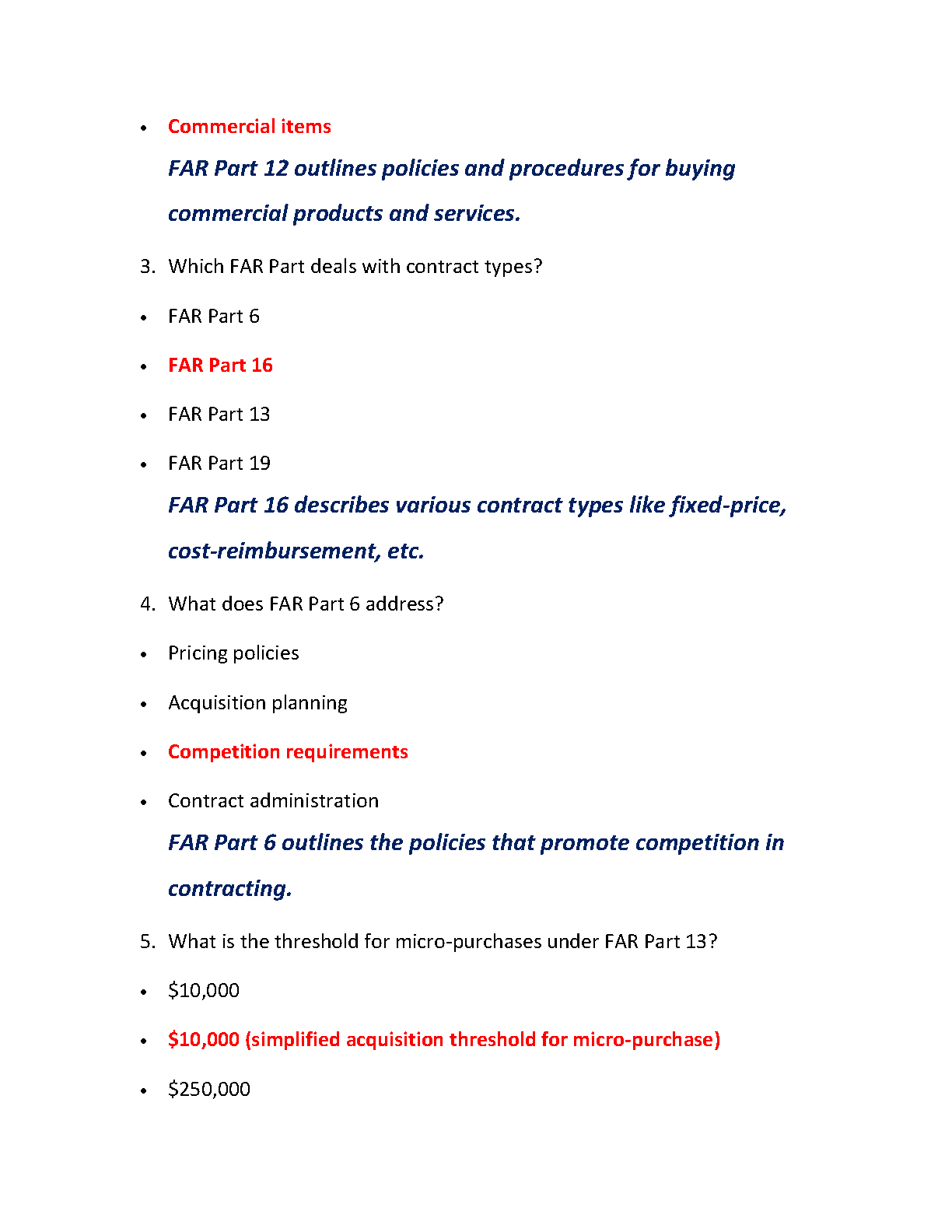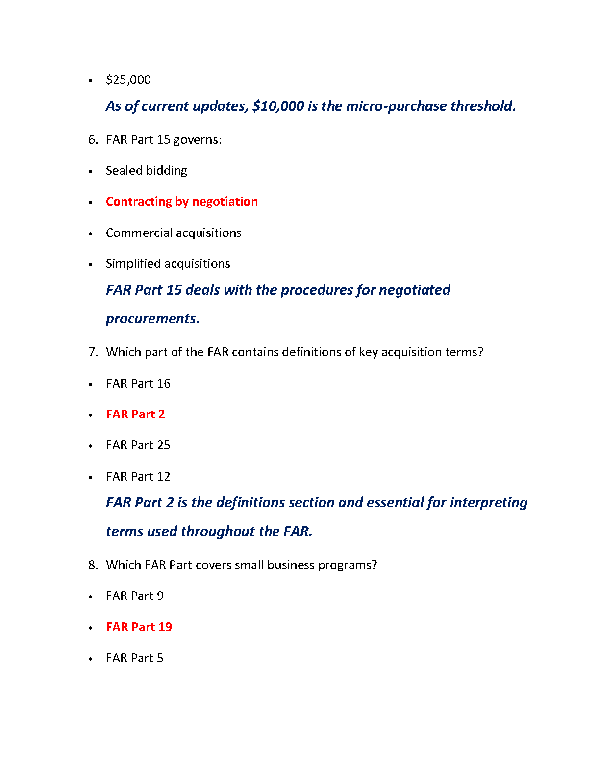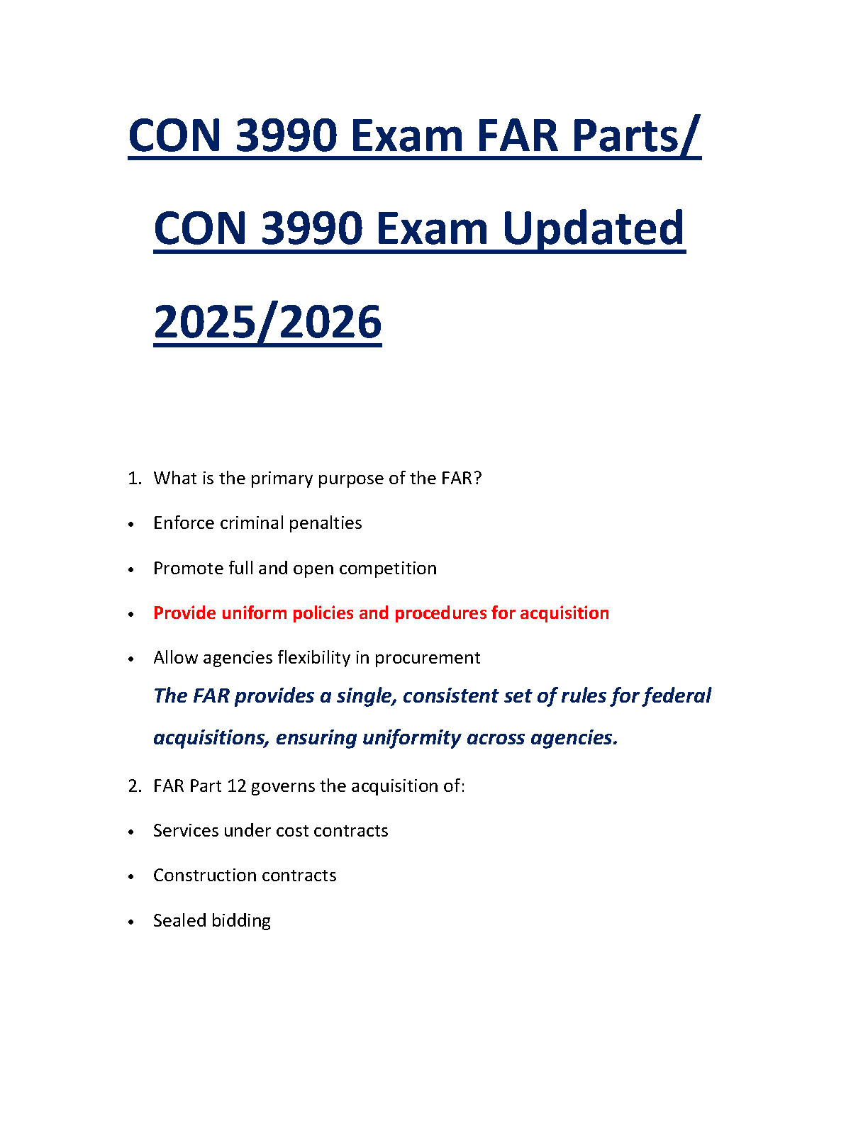 Master the complexities of the Federal Acquisition Regulation with our comprehensive test bank for the CON 3990 FAR Parts Exam. This up-to-date 2025/2026 resource is packed with a wide range of practice questions and meticulously verified answers, mirroring the actual exam format. Each answer is clearly explained to deepen your understanding of key concepts, such as the purpose of the FAR and specific regulations like FAR Part 12. Ideal for students aiming for a top grade, this study guide is your key to acing the CON 3990 exam with confidence.