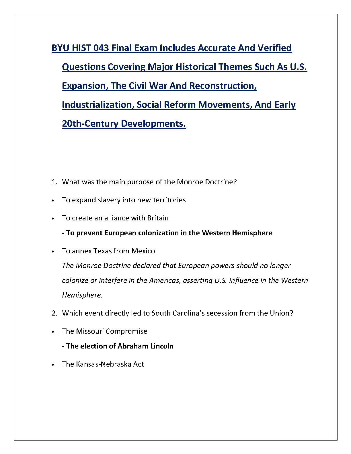 BYU HIST 043 Final Exam Test Bank: Verified Questions & Answers on U.S. History
