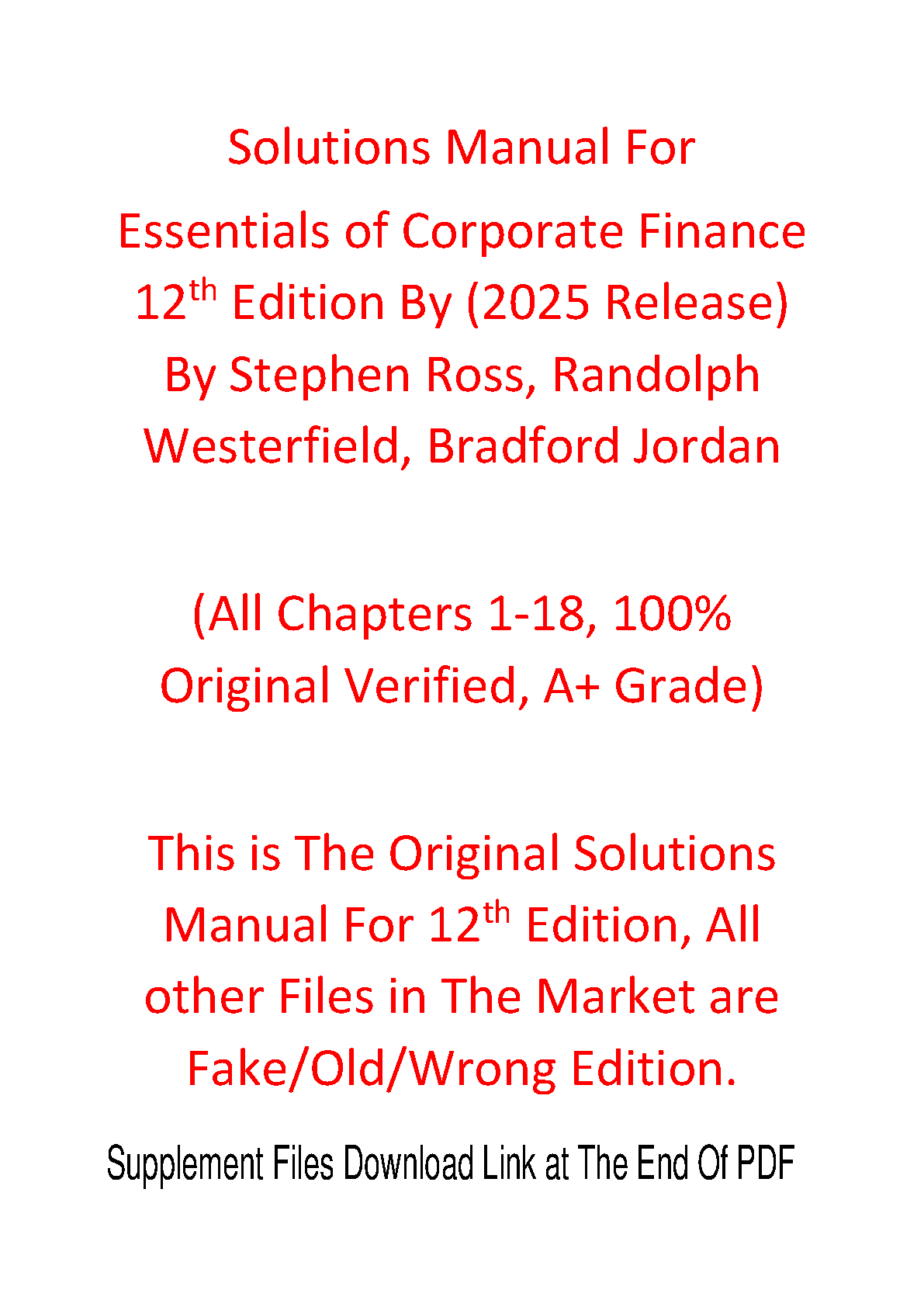 Solutions Manual for Essentials of Corporate Finance, 12th Edition by Stephen Ross, Randolph Westerfield, Bradford Jordan (2025 Release)