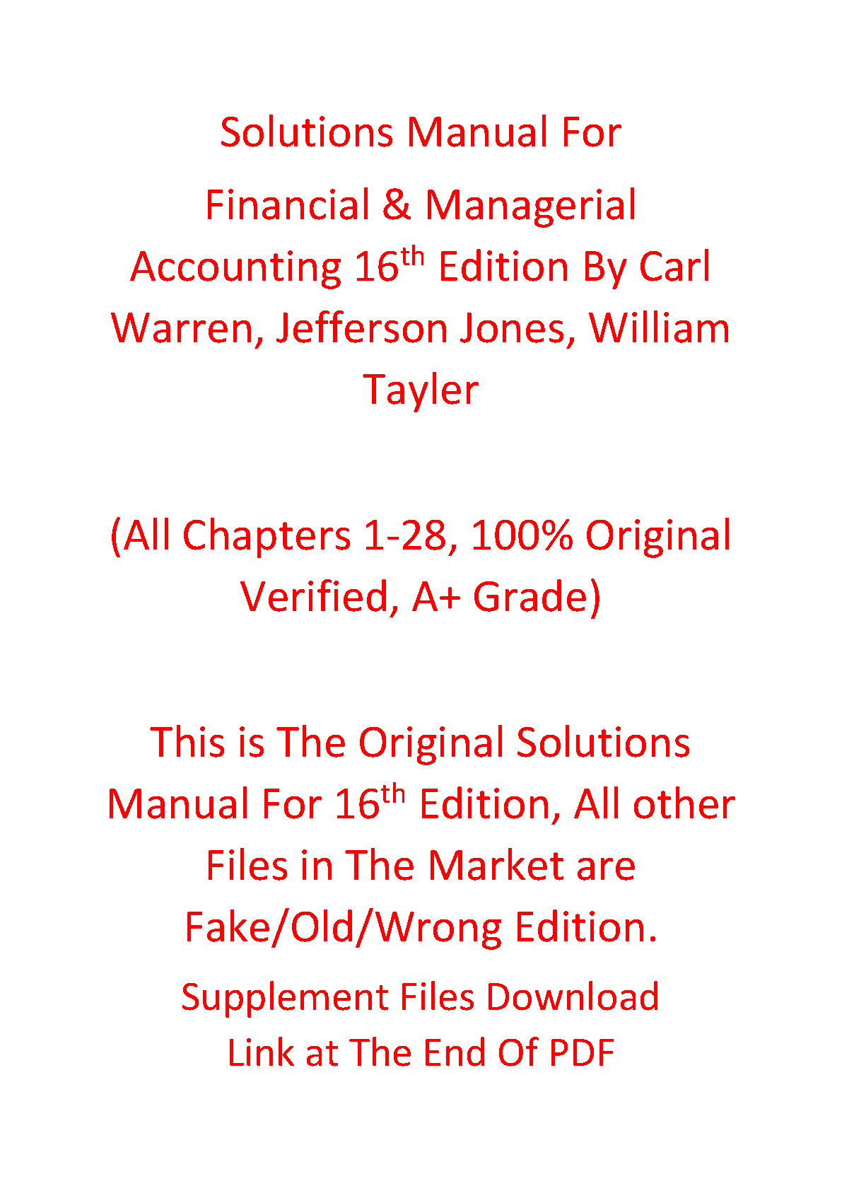 Official Solutions Manual for Financial & Managerial Accounting, 16th Edition by Carl S. Warren, Jefferson P. Jones, William B. Tayler (All Chapters 1-28 Included)