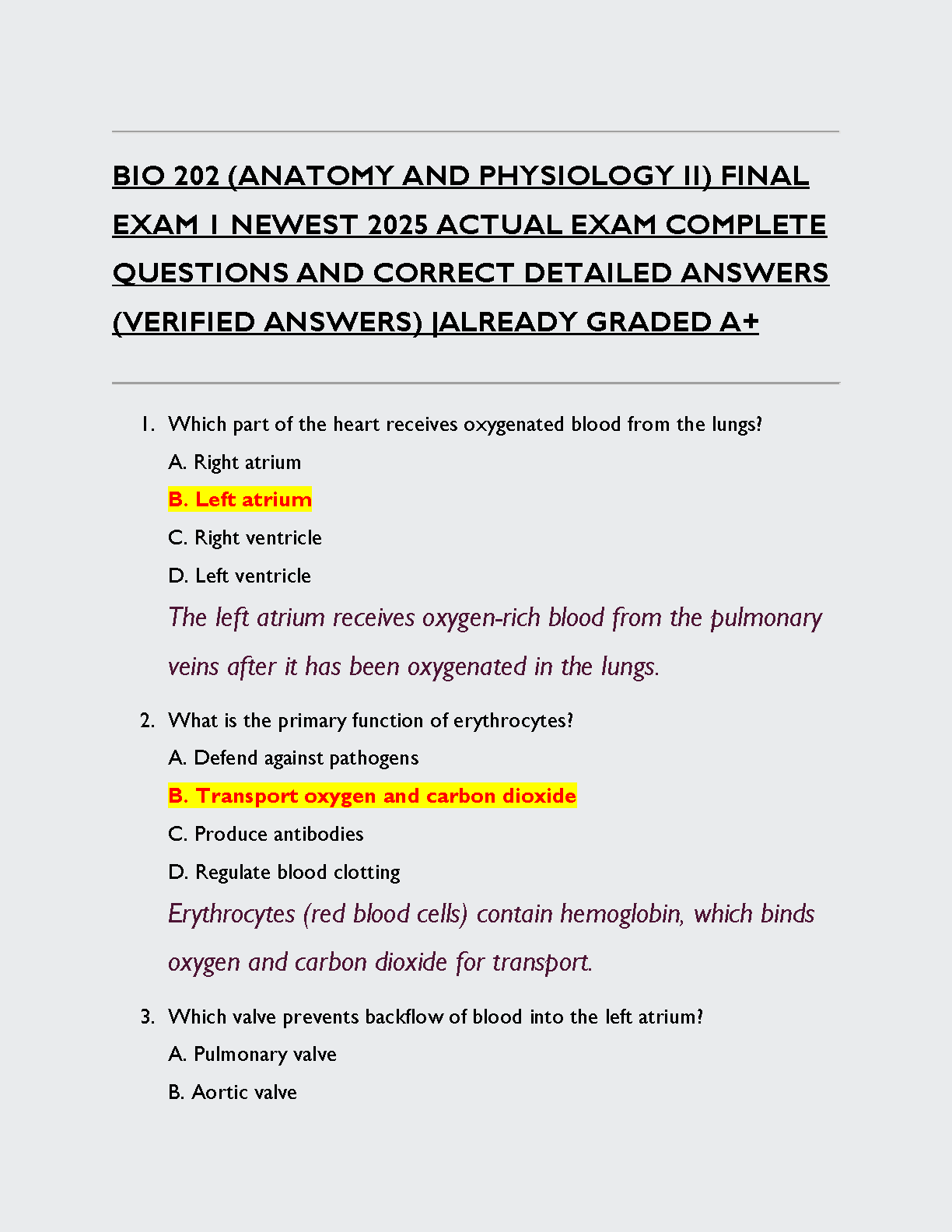 Ace your BIO 202 Final Exam with our latest 2025 test bank for Anatomy and Physiology II. This comprehensive resource is packed with actual exam questions, each accompanied by a correct, verified answer and a detailed explanation to ensure you grasp the concepts fully. Designed to help you study smarter, not harder, this A+ graded material covers all critical topics, giving you the confidence to pass your final exam on the first try and excel in your course. Stop worrying about resits and start preparing for success today!