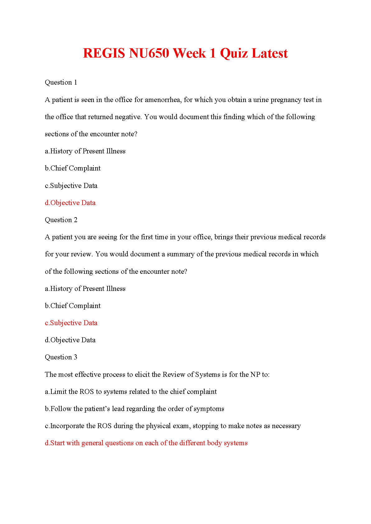 NU650 Advanced Health Assessment: Week 1 Quiz Test Bank | Regis College | Latest Version with Verified Answers