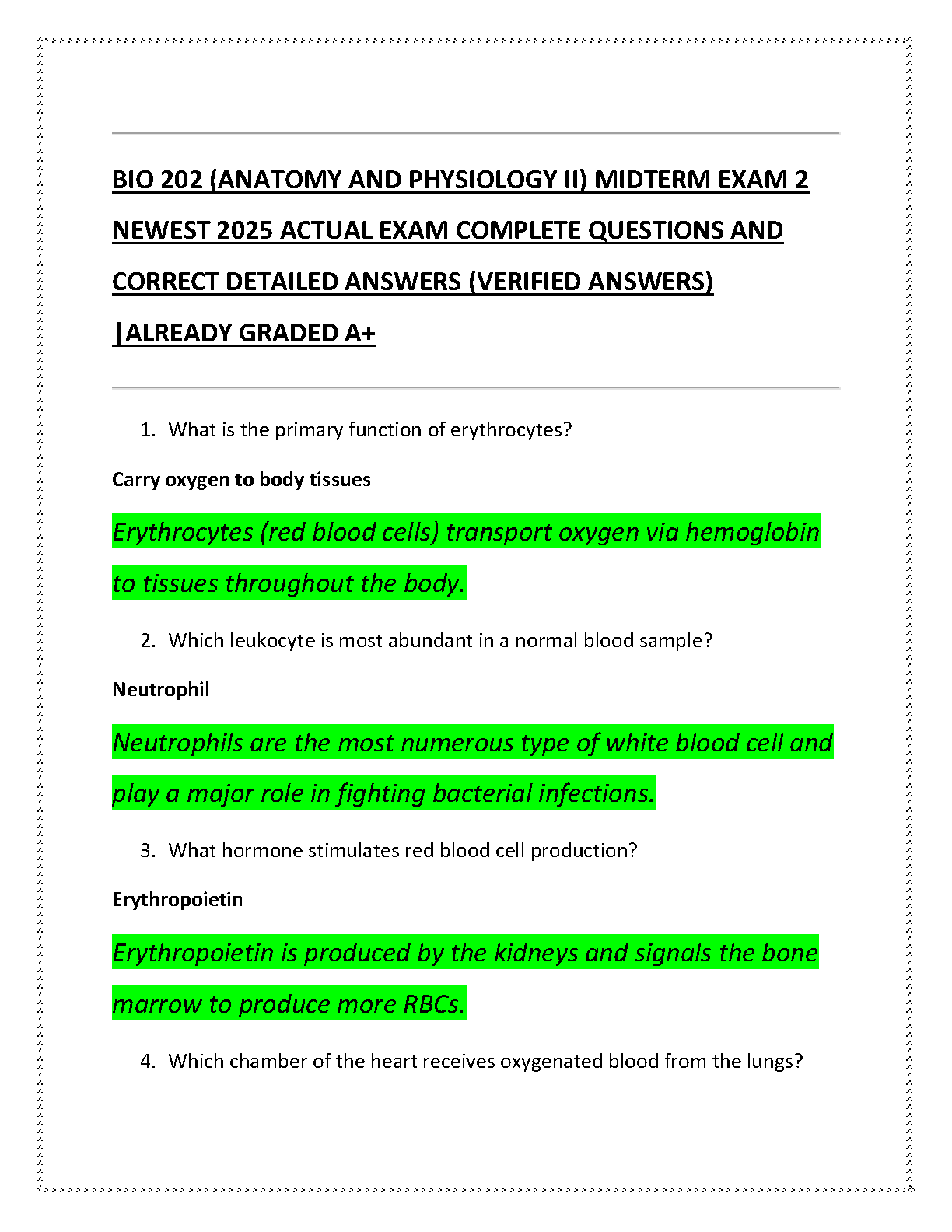Master the complexities of Anatomy and Physiology II and ace your BIO 202 Midterm 2 exam on your first attempt! This comprehensive study guide, updated for the 2025/2026 academic year, provides a complete set of actual exam questions paired with detailed, verified answers. Move beyond simple memorization with in-depth explanations that clarify key concepts in areas like the cardiovascular and hematologic systems. This resource is based on A+ graded material, designed to give you the confidence and knowledge needed to avoid resits and achieve top marks. Download now to get the ultimate preparation tool for your Anatomy and Physiology II midterm.