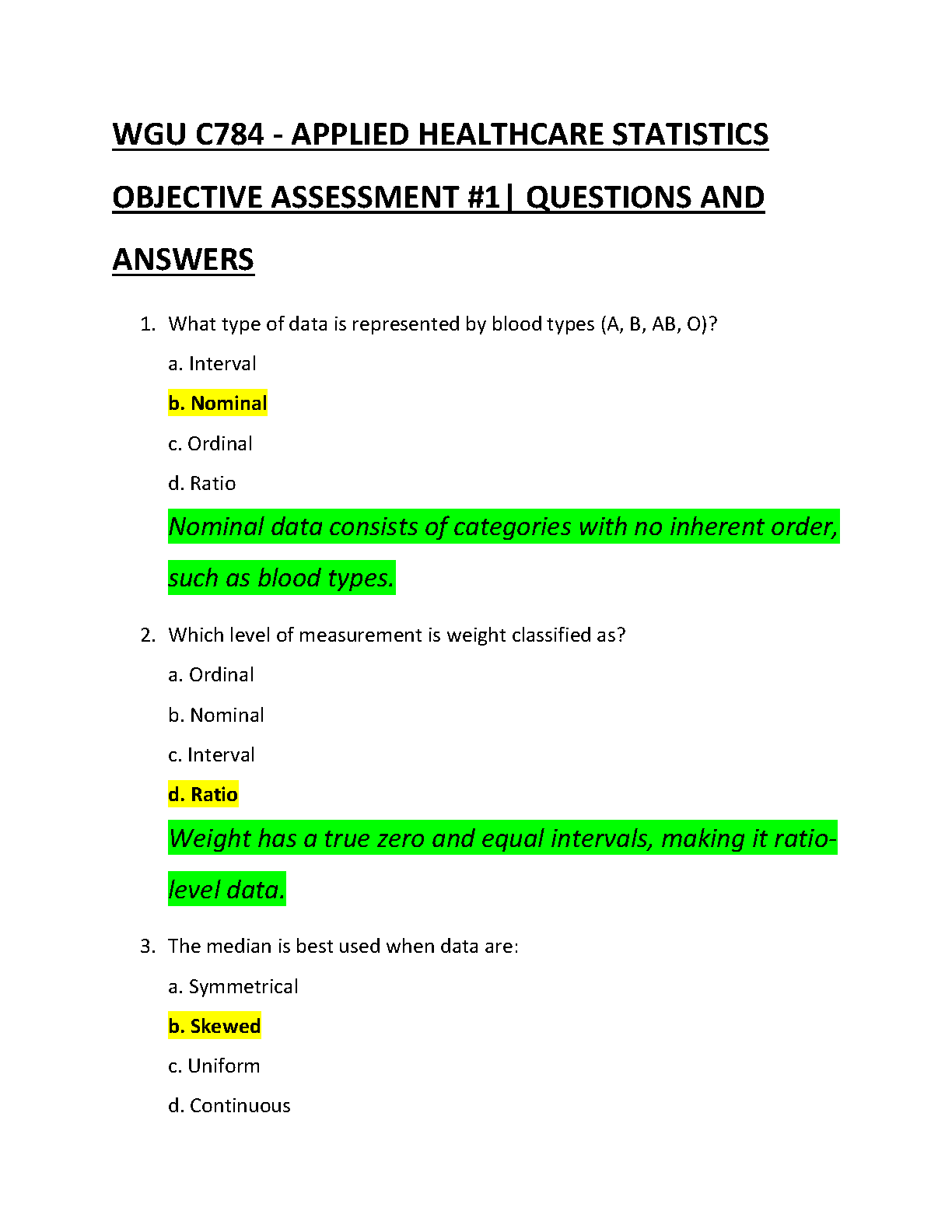 Unlock success in your WGU C784 course with our comprehensive test bank for the Applied Healthcare Statistics Objective Assessment #1. This essential study guide features a complete collection of exam-style questions, each paired with a verified answer and a clear, detailed explanation. Master critical topics such as data types (Nominal, Ratio, etc.) and statistical principles to confidently pass your assessment on the first attempt. This is the ultimate preparation tool for acing your WGU C784 exam.