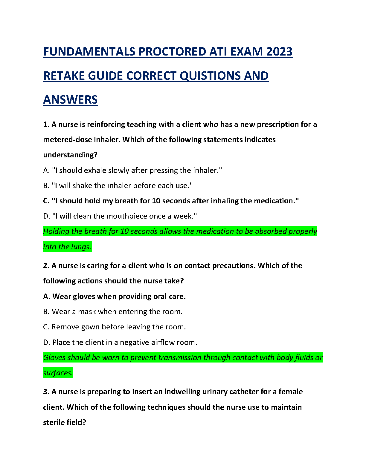 Unlock success and ace your nursing exams with our latest 2025-2026 study guide for the ATI Fundamentals Proctored Exam. This comprehensive resource is expertly designed for students aiming to pass on their first attempt or those preparing for a retake. It features a curated collection of verified exam questions complete with correct, detailed answers. Master key nursing concepts, from medication administration to infection control, and build the confidence you need to excel. Stop worrying about resits and start your journey to becoming a successful nurse today!