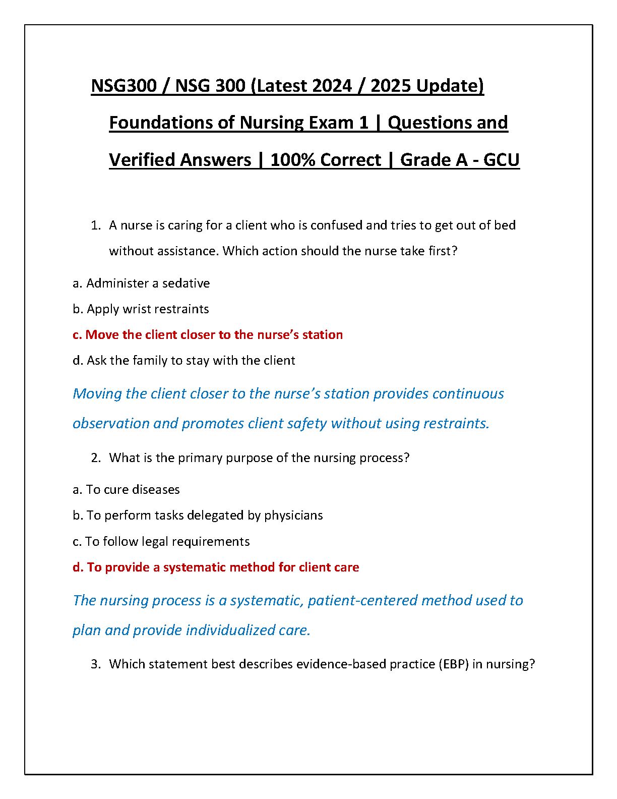 Achieve top marks in your nursing studies with this comprehensive test bank for NSG 300: Foundations of Nursing Exam 1 at GCU. This latest 2024/2025 updated resource is your key to success, featuring a complete set of exam questions with 100% verified answers and in-depth rationales. Each question is designed to reflect the actual exam, helping you master fundamental nursing concepts, from patient safety to the nursing process and evidence-based practice. Download now to study smart, boost your confidence, and secure a Grade A.