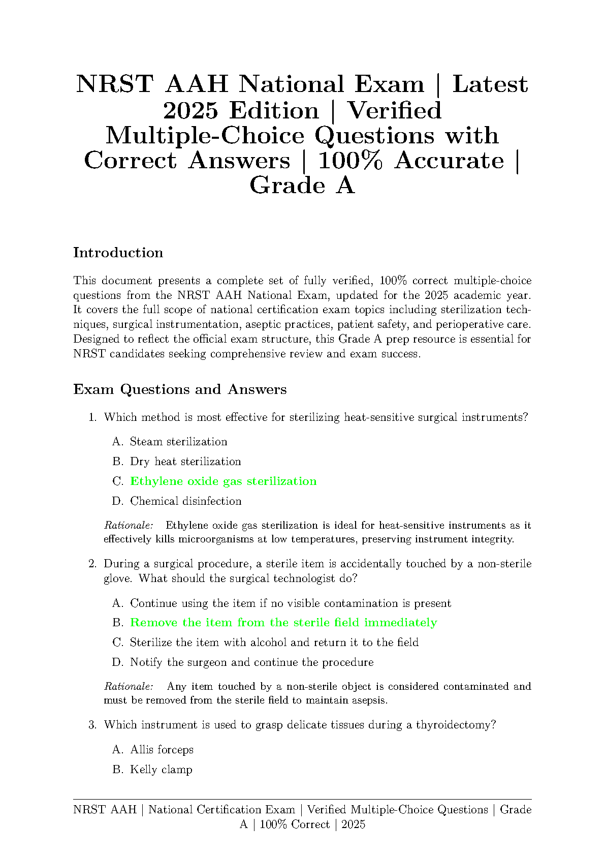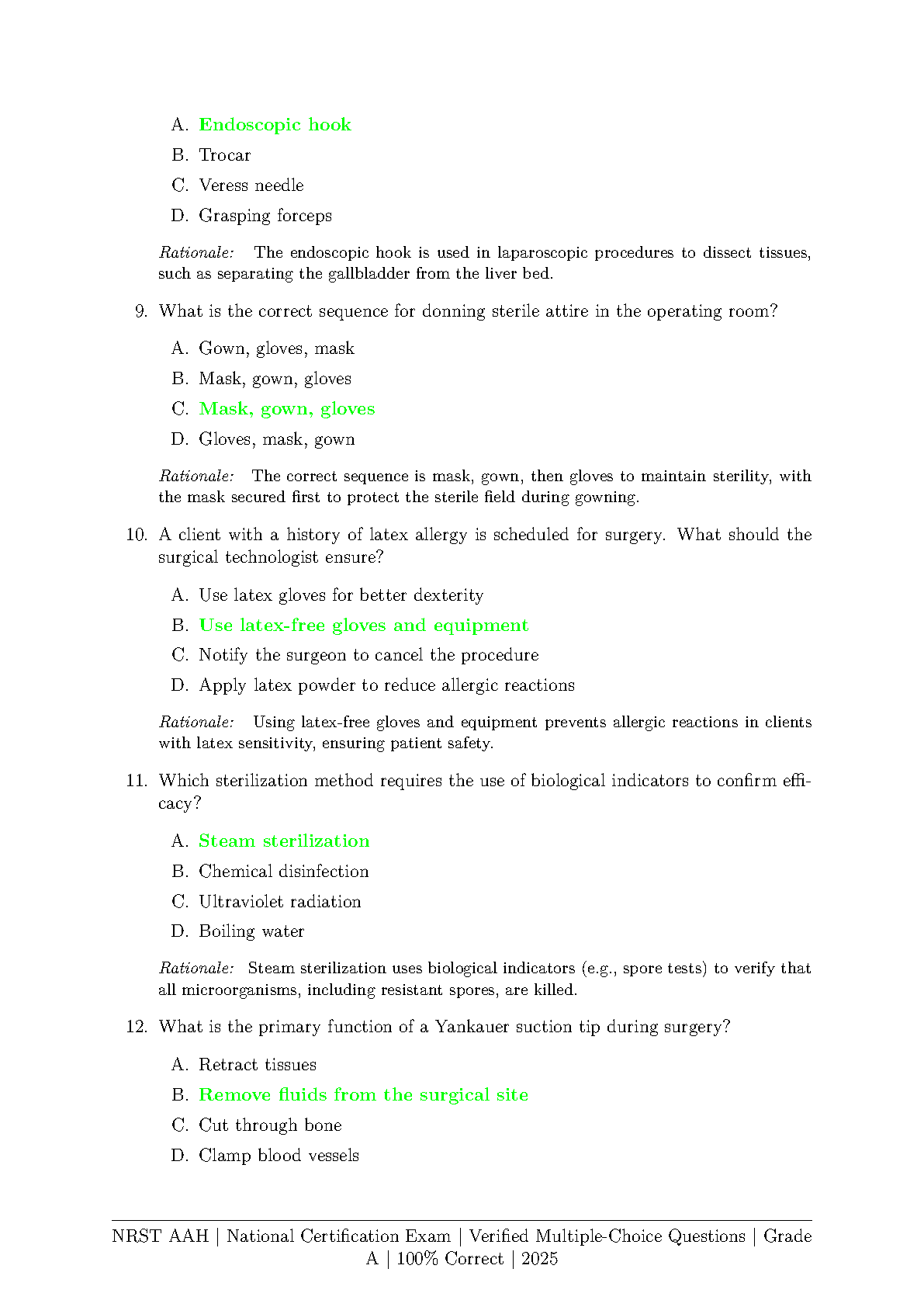 Ace your NRST AAH National Certification Exam on the first try! This comprehensive test bank, fully updated for the 2025 edition, provides a complete collection of multiple-choice questions, each with a verified correct answer and a detailed rationale. Master key topics including aseptic practices, sterilization techniques, surgical instrumentation, and patient safety. Designed to mirror the actual exam format, this study guide is your ultimate tool for effective preparation, helping you build confidence and secure a Grade A success.