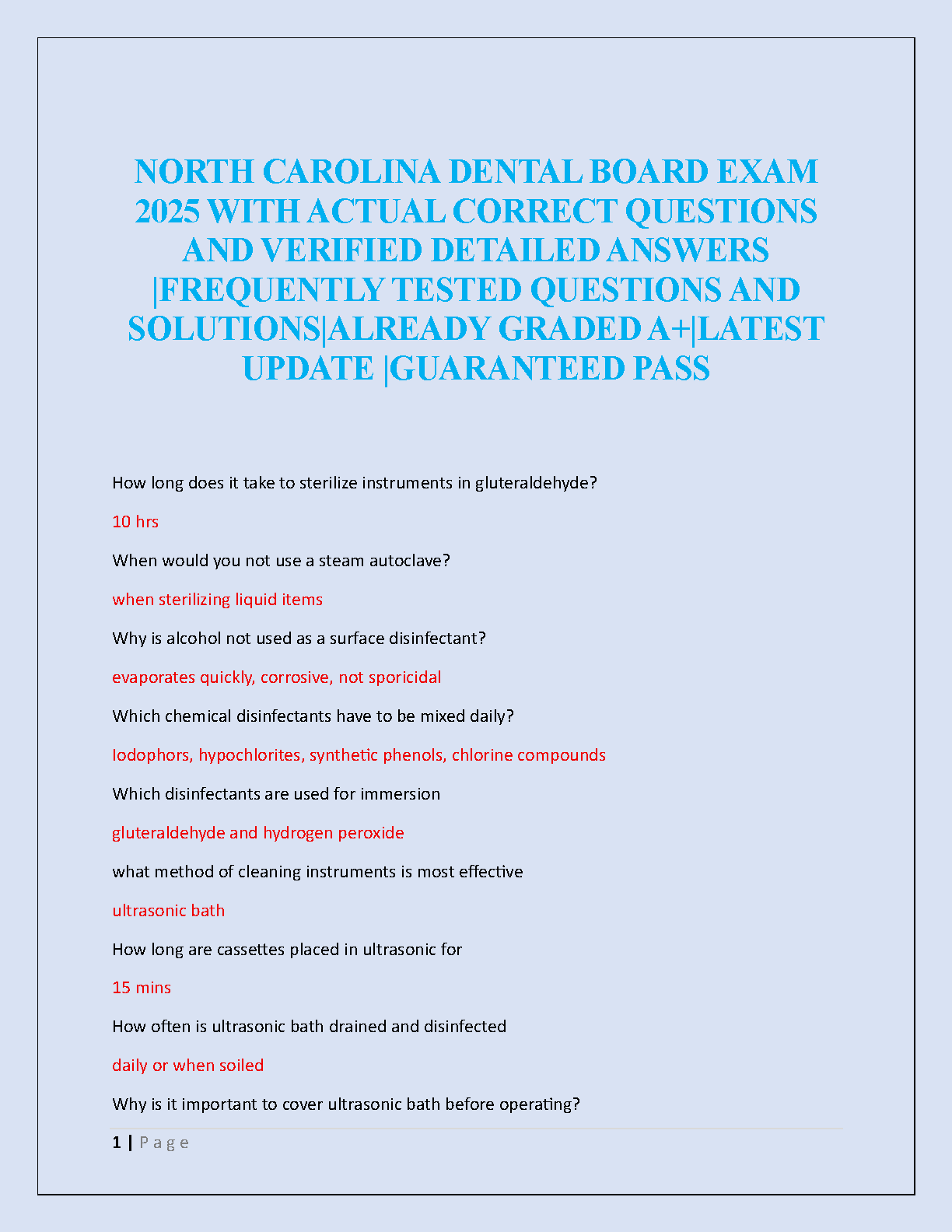 Ace your 2025 North Carolina Dental Board Exam with this ultimate study resource! This comprehensive test bank is meticulously compiled with the latest, frequently tested questions and 100% correct, verified answers. Covering crucial topics like instrument sterilization, disinfection protocols, and more, this guide provides detailed solutions to ensure you have a deep understanding of the material. Designed to help you study efficiently and pass on your first attempt, this A+ graded resource is your key to success. Get the confidence you need to excel and avoid resits with this guaranteed pass study guide.