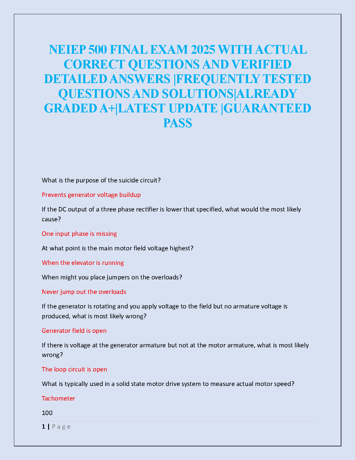 Ace your National Elevator Industry Educational Program (NEIEP) 500 final exam with this comprehensive and up-to-date test bank for 2025. This study guide is meticulously compiled with actual exam questions and verified, detailed answers, ensuring you are fully prepared for success. Our resource covers frequently tested topics such as suicide circuits, generator operations, motor drive systems, and more, providing solutions that have already earned an A+ grade. This test bank is your key to mastering the material and passing with confidence on your first try.